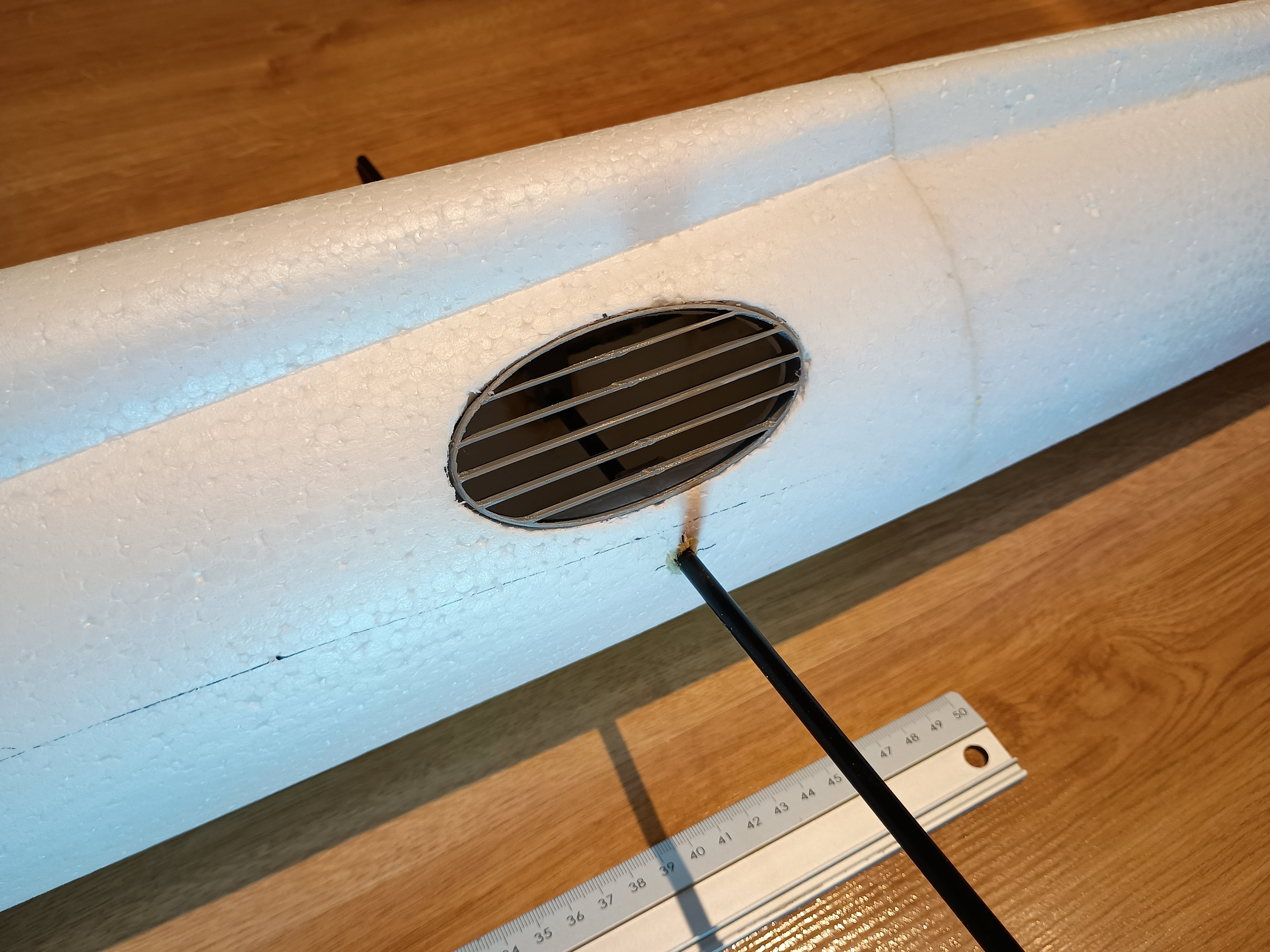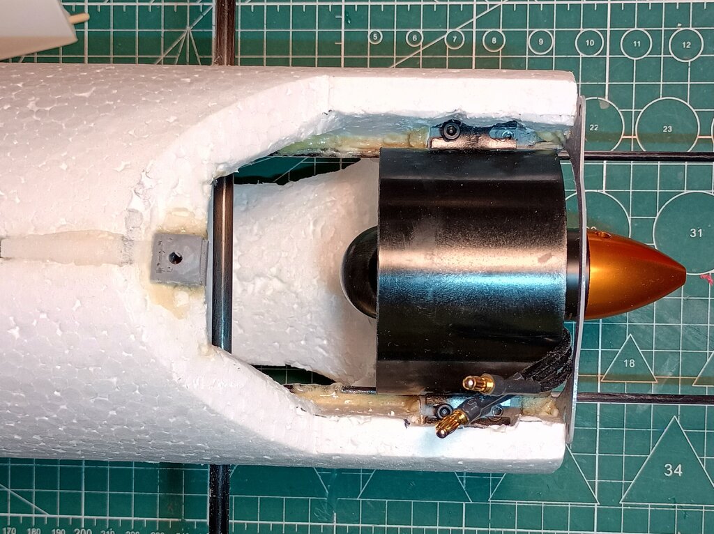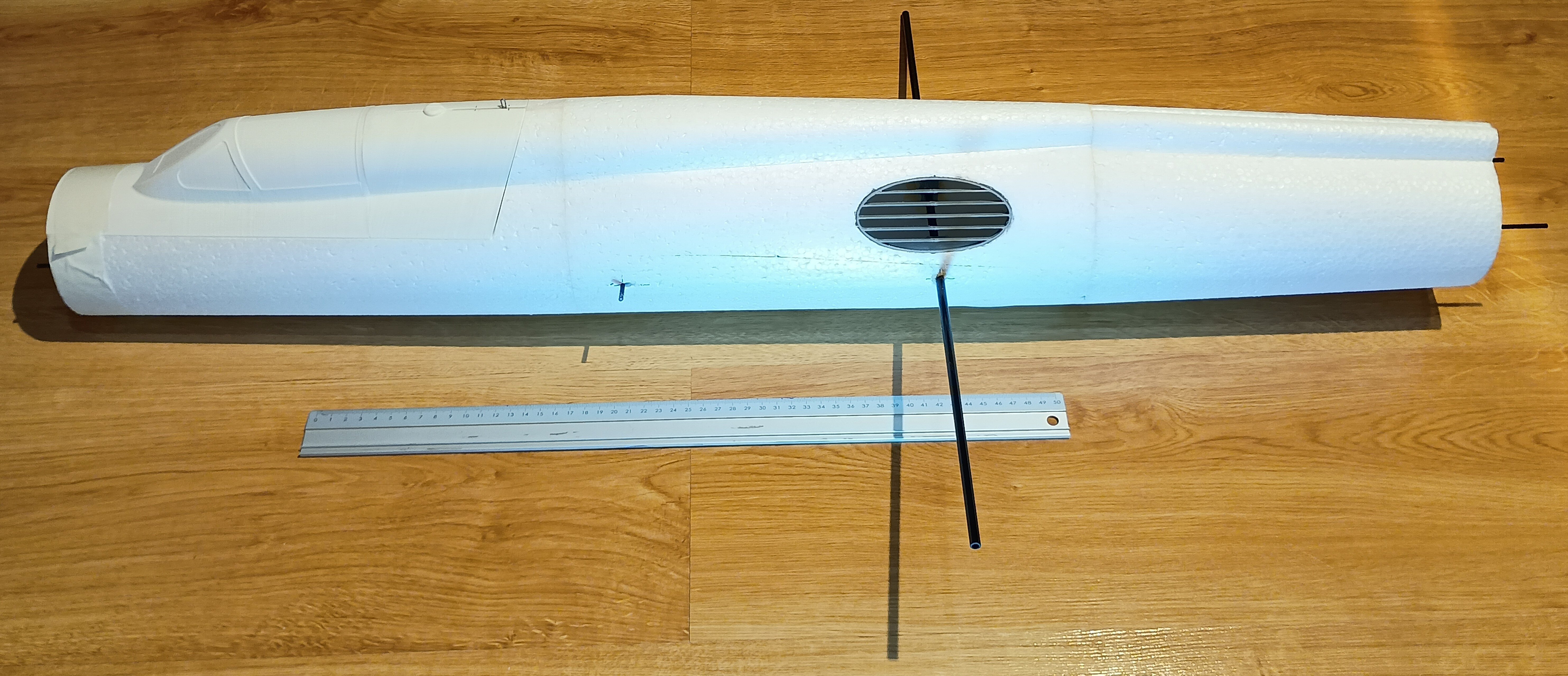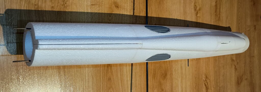 Powoli prace idą do przodu, trochę się dzieje, ale niewiele się zmienia Wkleiłem wręgę mocująca EDF i mocowanie pokrywy... pasuje Turbina się mieści, da się wyjąc i włożyć. Pokrywa mocowana na śrubkę. Mogłem teraz przykleić ostatni segment styropianowy, złożyć jakoś kadłub i trochę oszlifować. Włożyłem tez kratki bocznych wlotów, ale jeszcze ich nie wkleiłem. Przyznam, że kawał rury, choć jeszcze nie ma dyszy wylotowej i dziobu... Myślę, że to dobry czas, na wycięcie gniazd pod serwa wysokości i kierunku. Pociągnąć trochę kabli. Wiem, gdzie mają być wycięcia, a teraz to dobry moment.