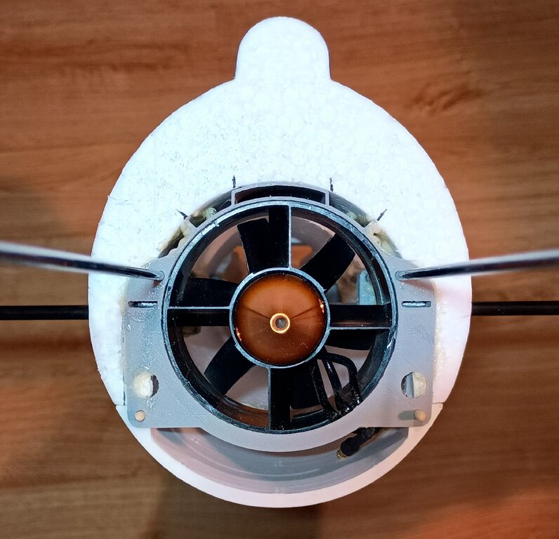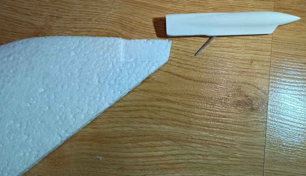 Zdecydowałem jednak, że otwierany właz zrobię cały drukowany. Miał mieć tylna część ze styropianu, ale i tak musiałbym zrobić tam jakiś zatrzask. Tak wydruk już zawiera gniazdo pod zamek kabinki. Zamek zrobiony z kawałka bowdena i sprężynki od długopisu. Środkowy drut wygiąłem w "omegę" i wkleiłem stoper. Obciąłem tak by skok był z 15mm - tak dla bezpieczeństwa. Oczywiście w styropianowa skorupę wklejam rurkę zewnętrzną bowdena jako gniazdo na bagnet zamka. Teraz mogę przykleić kolejny element kadłuba. Jak już pisałem stelaż wewnętrzny został sklejony tak by można było wyciągnąć dźwigary i mocowanie EDF. Daje to możliwość nasuwania styropianowej skorupy i dokładne dopasowanie elementów. Nasunąłem kolejną skorupę, usunąłem styropian spod krzyżaków dźwigarów i mocowania EDF. Od środka łatwo wybić w styropianie otwory pod dźwigary - daje to czyste otwory i mocną skorupę. Odziwo wszystko pasuje Jak widać mocowanie EDF na górze ma szczelinę/kanał - na przewody serw kierunku i wysokości. Po spasowaniu wszystkiego element gotowy do przyklejenia. Na płaszczyźnie łączenia jest naddatek w styropianie, po sklejeniu się doszlifuje, wygładzi i będzie git... Teraz się klei.... c.d.n.