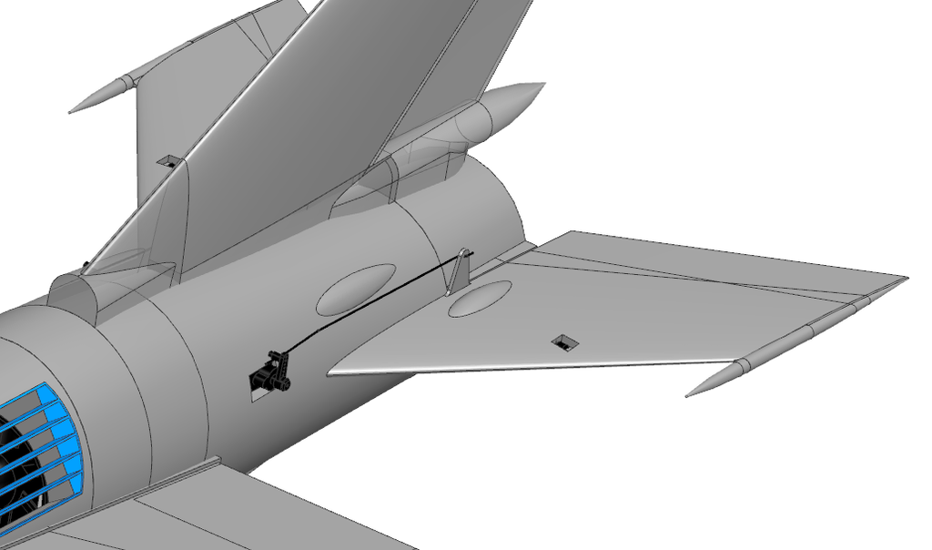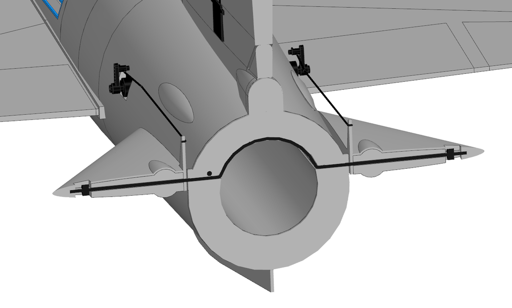 Spróbuję dzisiaj wydrukować ster od razu z dźwignią popychacza.... Tak by to wyglądało z serwem... to samo po drugiej stronie... Serwa nie wchodzą w kanał EDF... Oś obrotu sterów chcę wygiąć z drutu fi2, wygiąć w kształt omegi i wkleić tak by nie zakłócał kanału EDF...