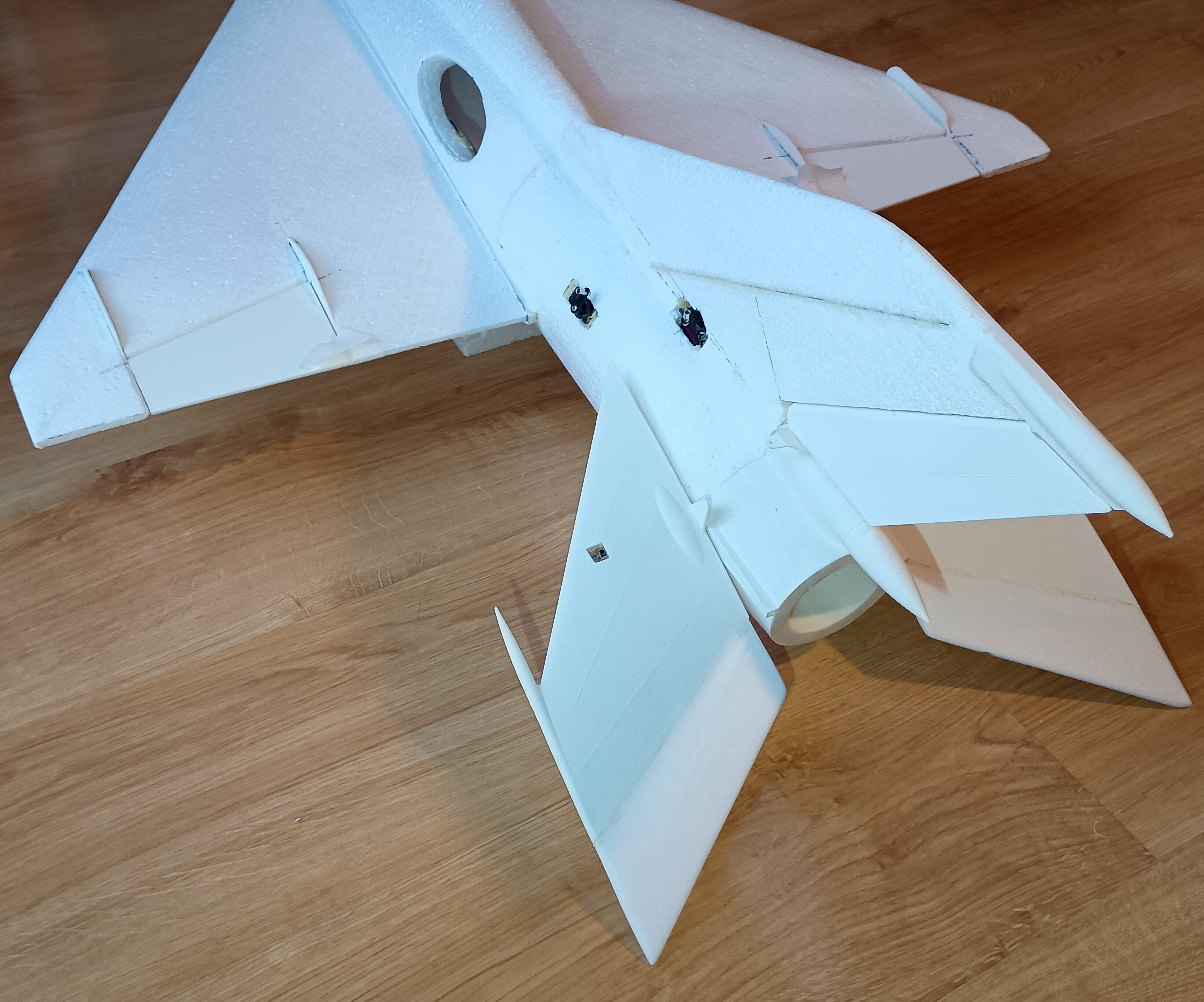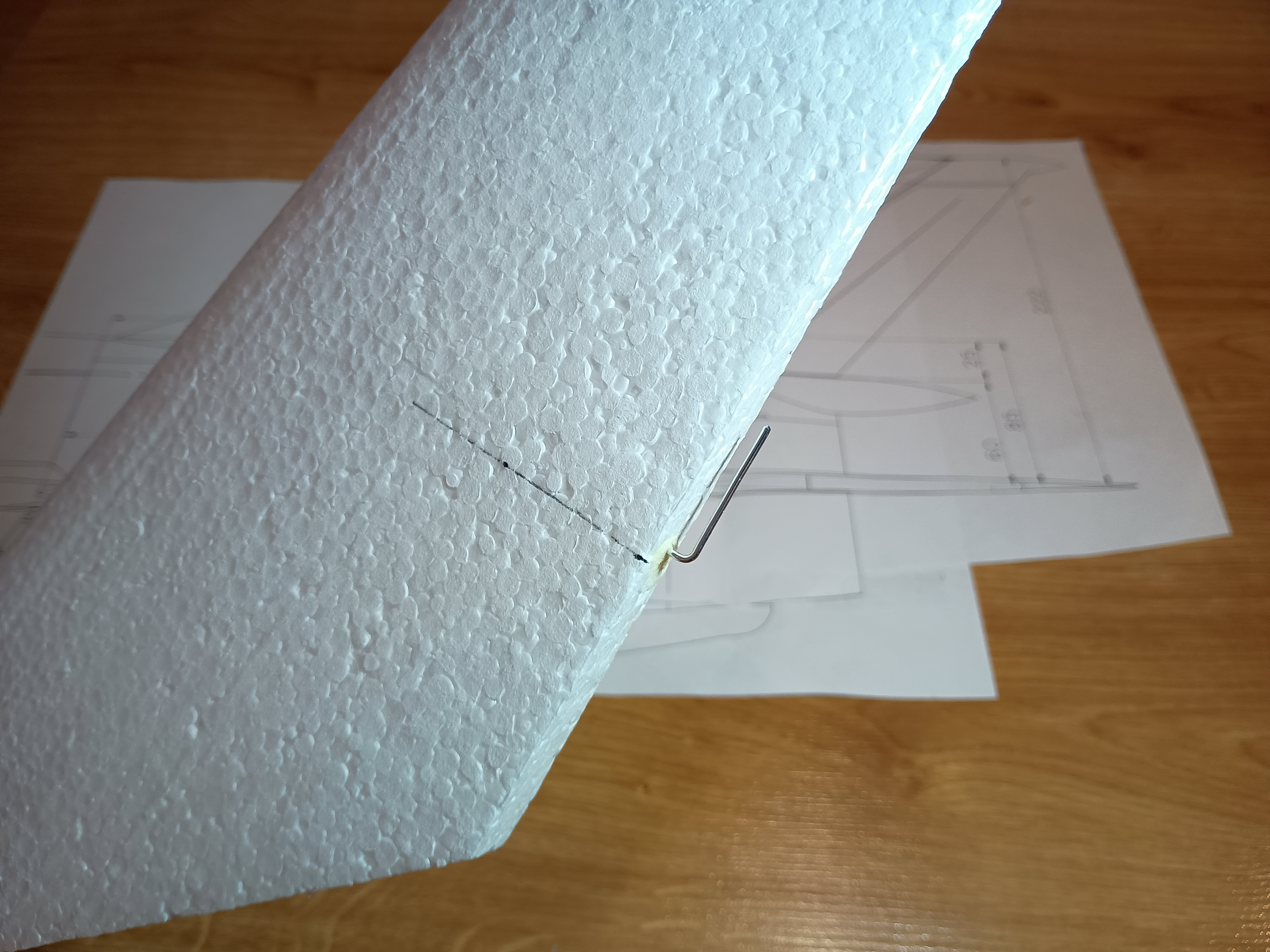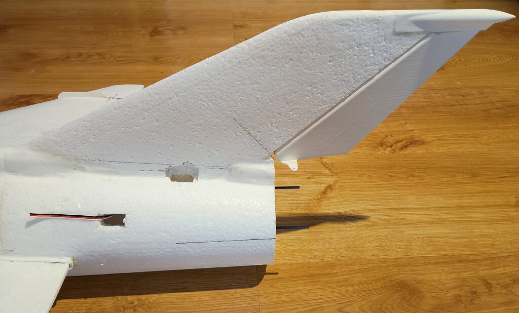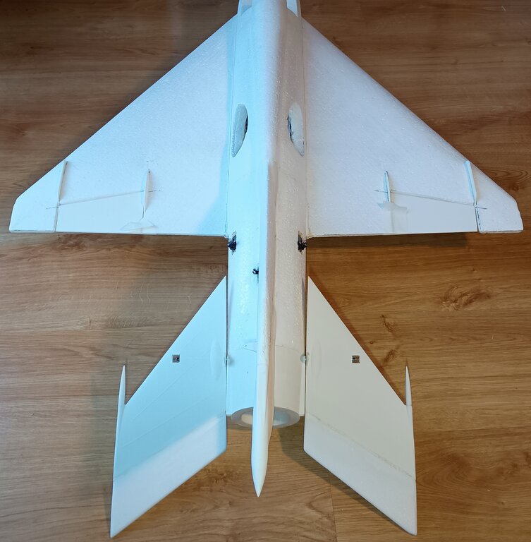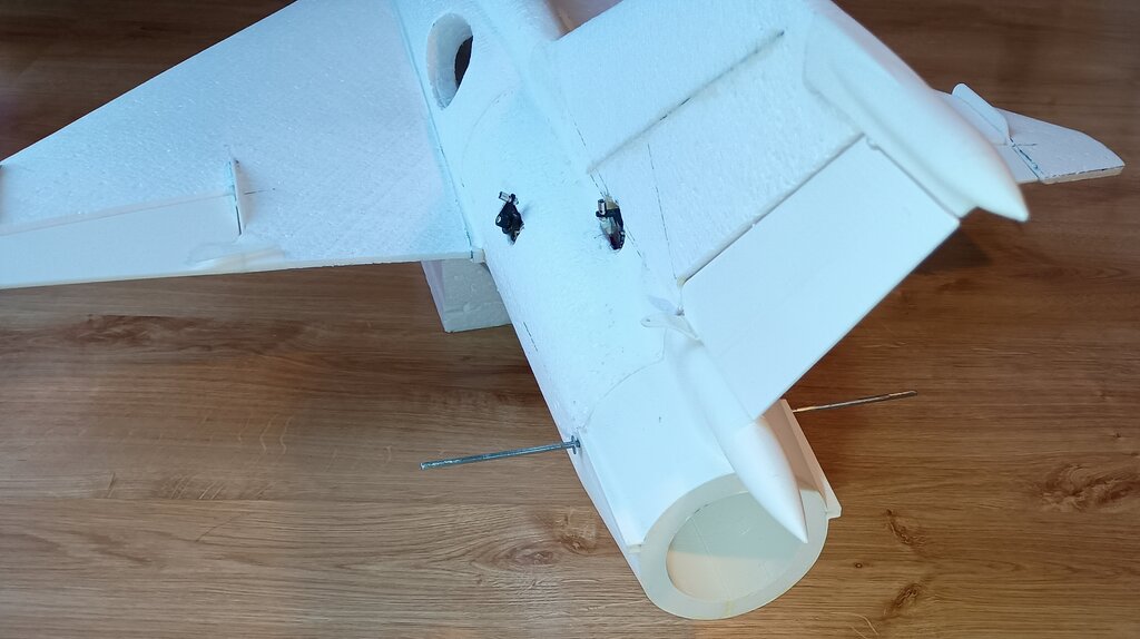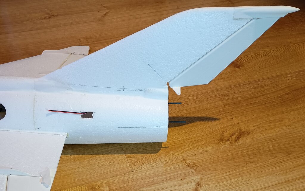 Prace spowolniły, ale model powstaje dalej... Udało mi się wyciąć gniazda w kadłubie pod serwa kierunku i wysokości, nawet zgrabnie przeprowadziłem kable na przedłużki do serw... i sobie przypomniałem, że to nie wszystkie kable, że przecież jeszcze dwa serwa lotek... No i prace przeniosły się na skrzydła.... MIG21 ma u nasady skrzydła charakterystyczny profil, nie chciałem go pominąć w modelu. Postanowiłem wyciąć go z depronu 6mm, szablon i wycinanki Z szablonu przeniosłem otwory pod dźwigary co pomoże spozycjonować skrzydło przy klejeniu. Następnie przykleiłem depron do skrzydła, na kadłubie odrysowałem kształt profilu przykadłubowego. Kadłub jest owalny, a depron płaski, dlatego muszę podebrać nieco kadłub by utworzyć płaszczyznę dla przyklejenia skrzydła. Jest już baza dla skrzydła. Czas na serwa lotek... Lotki zrobiłem na leniucha... czyli wydrukowałem Pomysł jest taki.... Drukowana lotka z osią obrotu, w którą wklejam dwa druciki po obu stronach. W skrzydle wycinam miejsce na lotkę... Skrzydło ma swoje kierownice, wystające osłony i tez chciałem je podkreślić przy okazji mocowania lotek Postanowiłem, że osie lotki będą osadzone w wydrukowanych "blaszkach", które wkleję w skrzydło... Pierwszą wklejam blaszkę wewnętrzną. Wyznaczam linie osi lotki. Wycinam na nią miejsce w skrzydle. Potem wklejam blaszkę zewnętrzną już z lotką wsunięta w otwory. I wszystko ładnie i lekko chodzi i wygląda całkiem nieźle. Czas na serwa... i tu standardzik, wyznaczyłem linię prostopadłą do osi lotki, jak widać podgrzałem i wygiąłem dźwignie drukowanej lotki by odpowiadała osi obrotu. Szablonik i odrysowanie serwa na skrzydle. Wycinanie i dłubanie styropianu i wklejenie serwa. Kabel puszczę wzdłuż głównego dźwigara. Teraz mogę przedłużyć kable serwa. Popychaczy nie montuje, na to przyjdzie czas