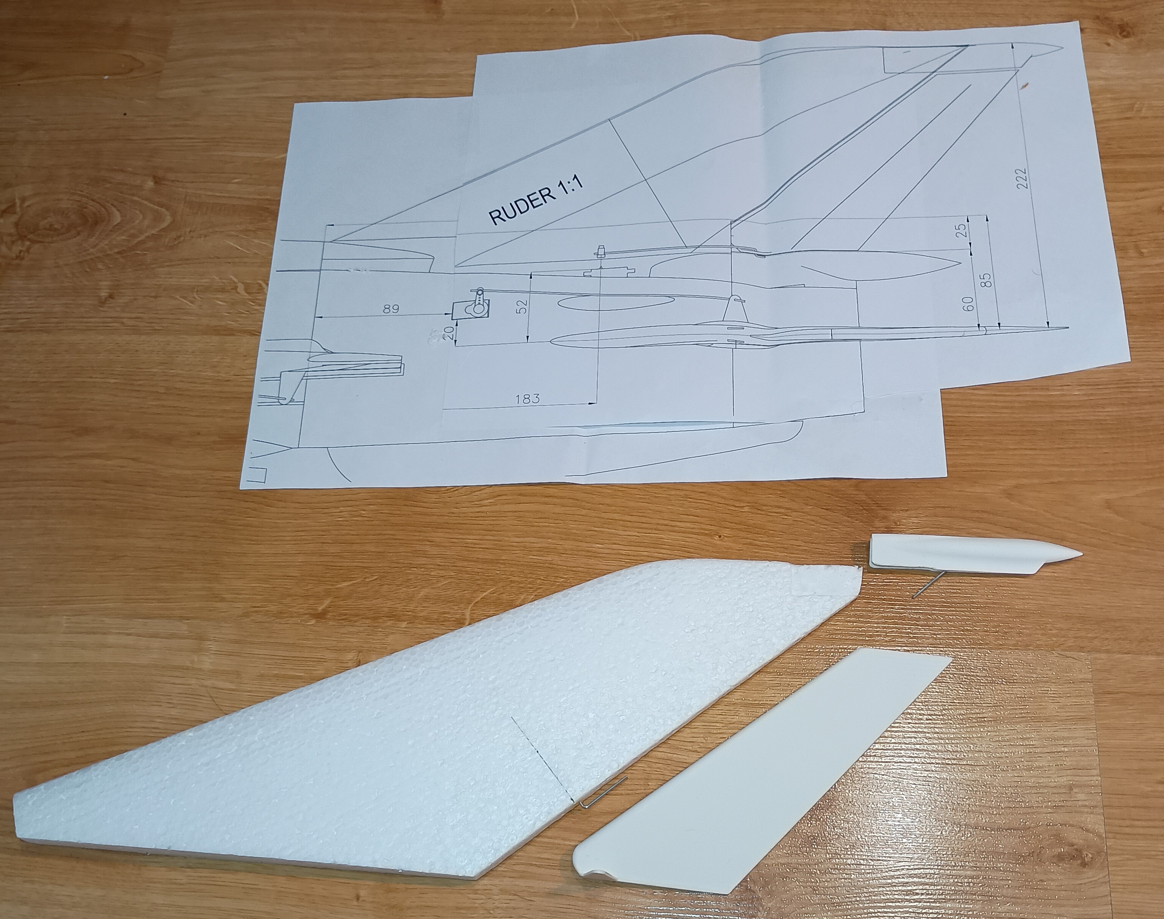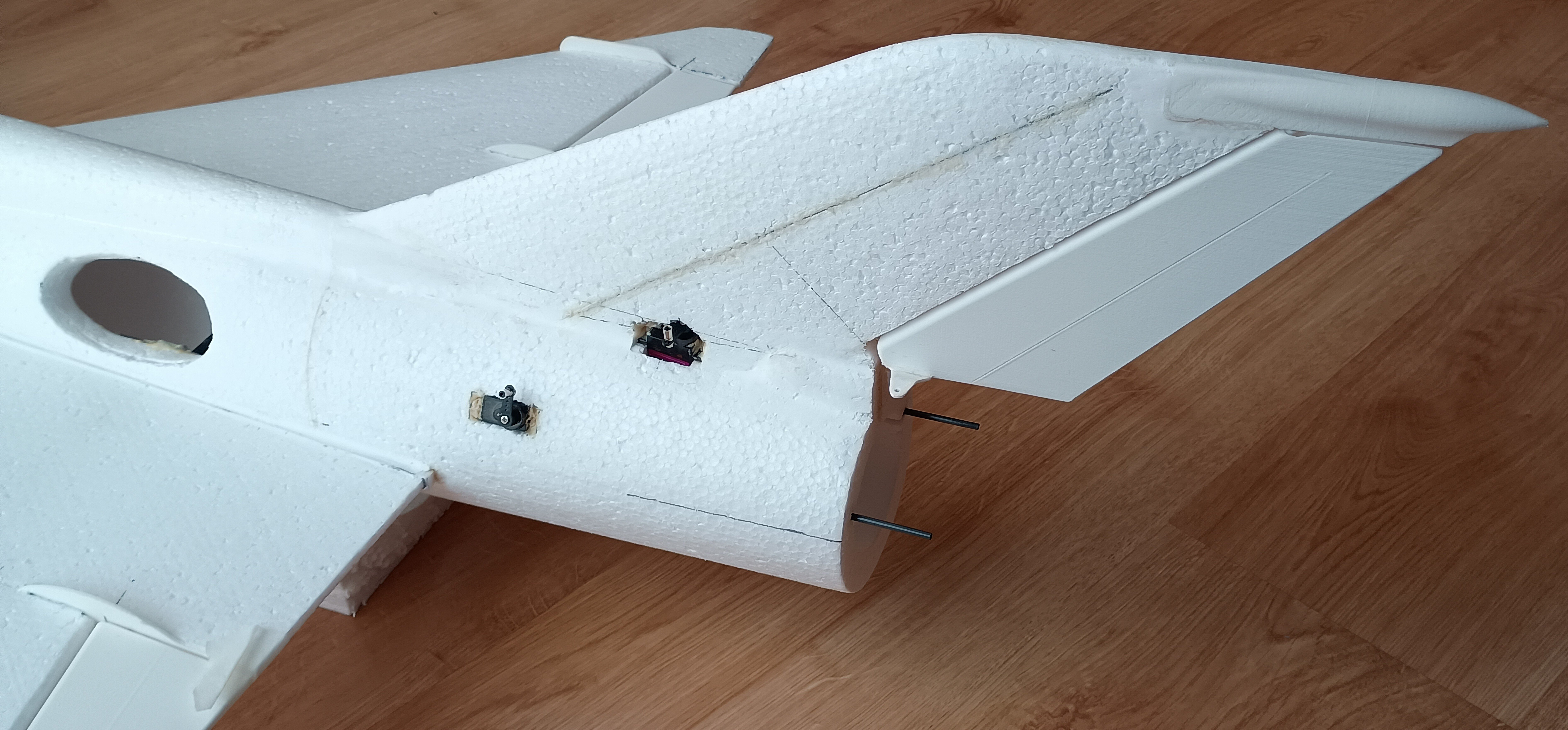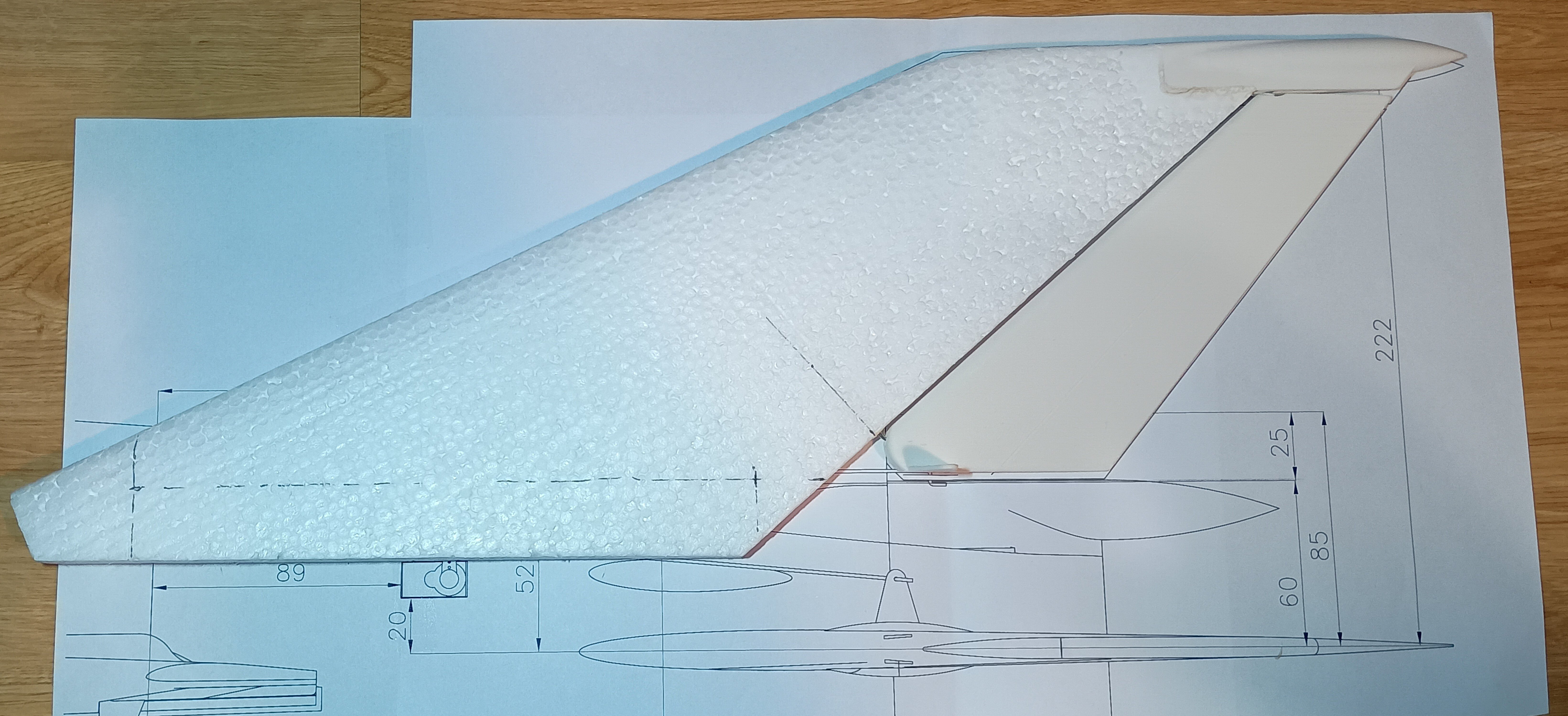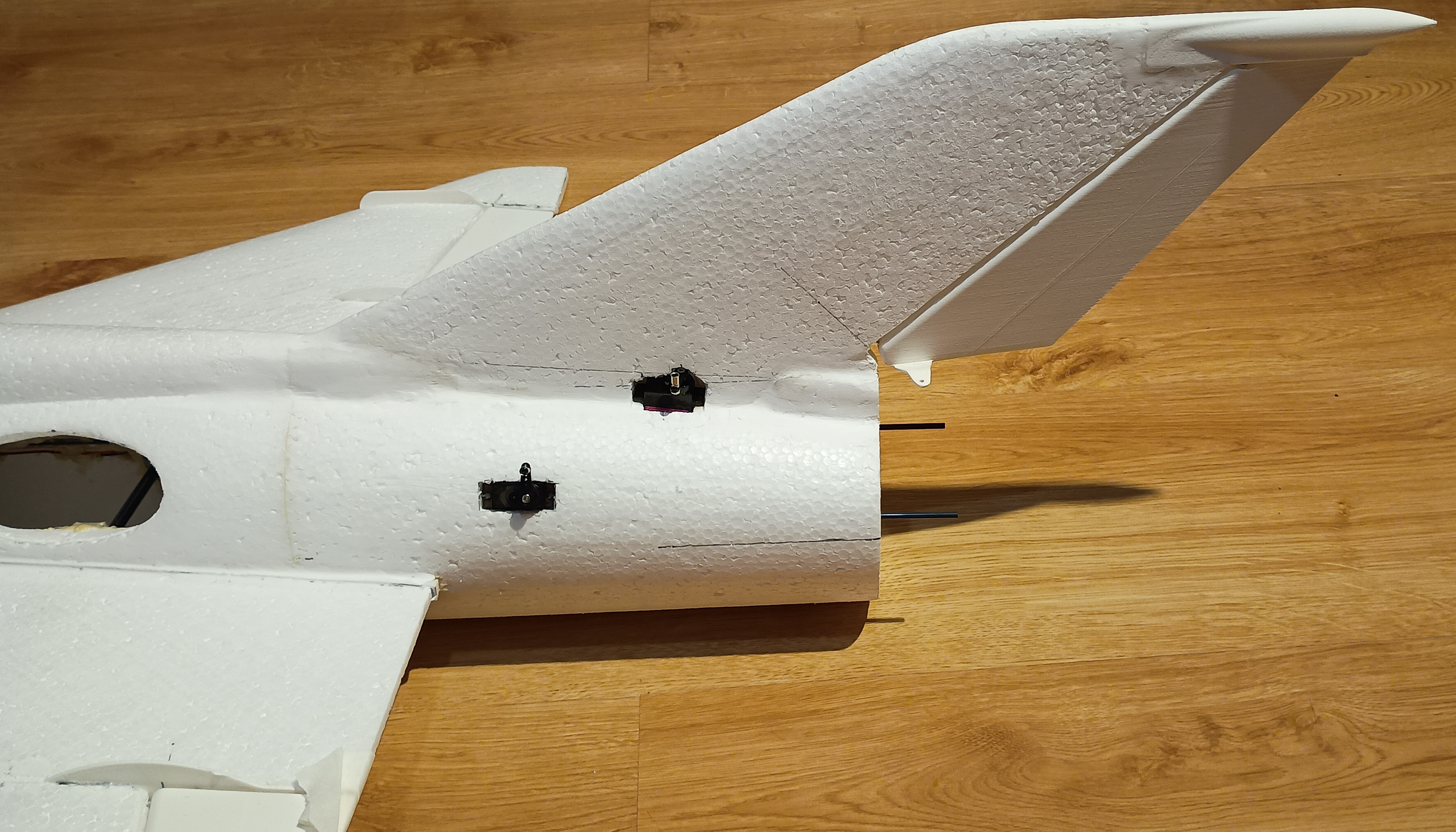 Prace spowolniły, ale model powstaje dalej... Udało mi się wyciąć gniazda w kadłubie pod serwa kierunku i wysokości, nawet zgrabnie przeprowadziłem kable na przedłużki do serw... i sobie przypomniałem, że to nie wszystkie kable, że przecież jeszcze dwa serwa lotek... No i prace przeniosły się na skrzydła.... MIG21 ma u nasady skrzydła charakterystyczny profil, nie chciałem go pominąć w modelu. Postanowiłem wyciąć go z depronu 6mm, szablon i wycinanki Z szablonu przeniosłem otwory pod dźwigary co pomoże spozycjonować skrzydło przy klejeniu. Następnie przykleiłem depron do skrzydła, na kadłubie odrysowałem kształt profilu przykadłubowego. Kadłub jest owalny, a depron płaski, dlatego muszę podebrać nieco kadłub by utworzyć płaszczyznę dla przyklejenia skrzydła. Jest już baza dla skrzydła. Czas na serwa lotek... Lotki zrobiłem na leniucha... czyli wydrukowałem Pomysł jest taki.... Drukowana lotka z osią obrotu, w którą wklejam dwa druciki po obu stronach. W skrzydle wycinam miejsce na lotkę... Skrzydło ma swoje kierownice, wystające osłony i tez chciałem je podkreślić przy okazji mocowania lotek Postanowiłem, że osie lotki będą osadzone w wydrukowanych "blaszkach", które wkleję w skrzydło... Pierwszą wklejam blaszkę wewnętrzną. Wyznaczam linie osi lotki. Wycinam na nią miejsce w skrzydle. Potem wklejam blaszkę zewnętrzną już z lotką wsunięta w otwory. I wszystko ładnie i lekko chodzi i wygląda całkiem nieźle. Czas na serwa... i tu standardzik, wyznaczyłem linię prostopadłą do osi lotki, jak widać podgrzałem i wygiąłem dźwignie drukowanej lotki by odpowiadała osi obrotu. Szablonik i odrysowanie serwa na skrzydle. Wycinanie i dłubanie styropianu i wklejenie serwa. Kabel puszczę wzdłuż głównego dźwigara. Teraz mogę przedłużyć kable serwa. Popychaczy nie montuje, na to przyjdzie czas