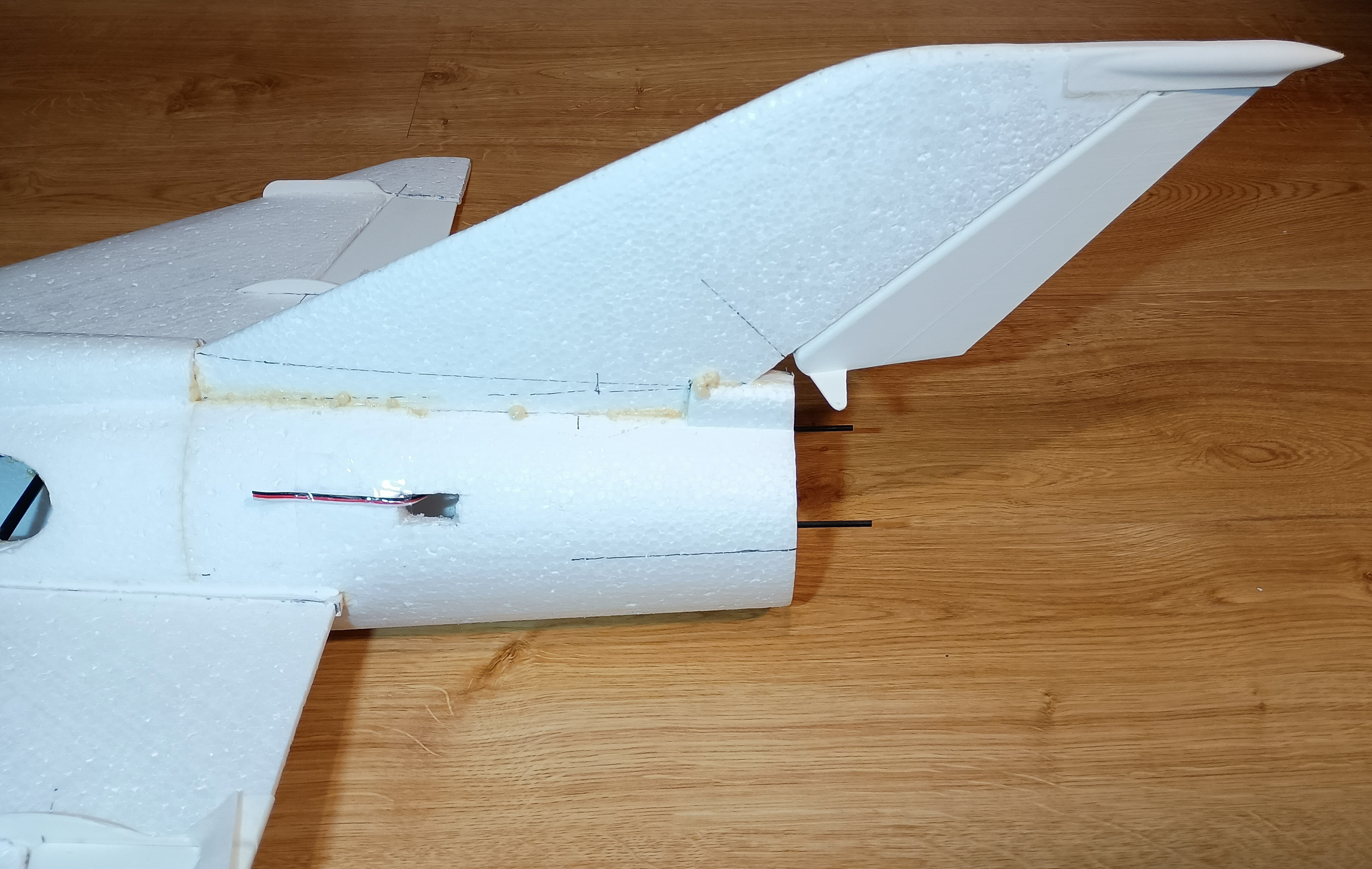 Nie pozostało nic innego jak przykleić skrzydła, przeprowadzić kable serw, delikatnie zaszpachlować. Na końcach wkleiłem wzmocnienie z płaskownika węglowego by końcówka była sztywniejsza. Trochę szpachlowania, wszyło całkiem nieźle.... i można pójść dalej.. czas na statecznik pionowy Całkiem spora strzała.....