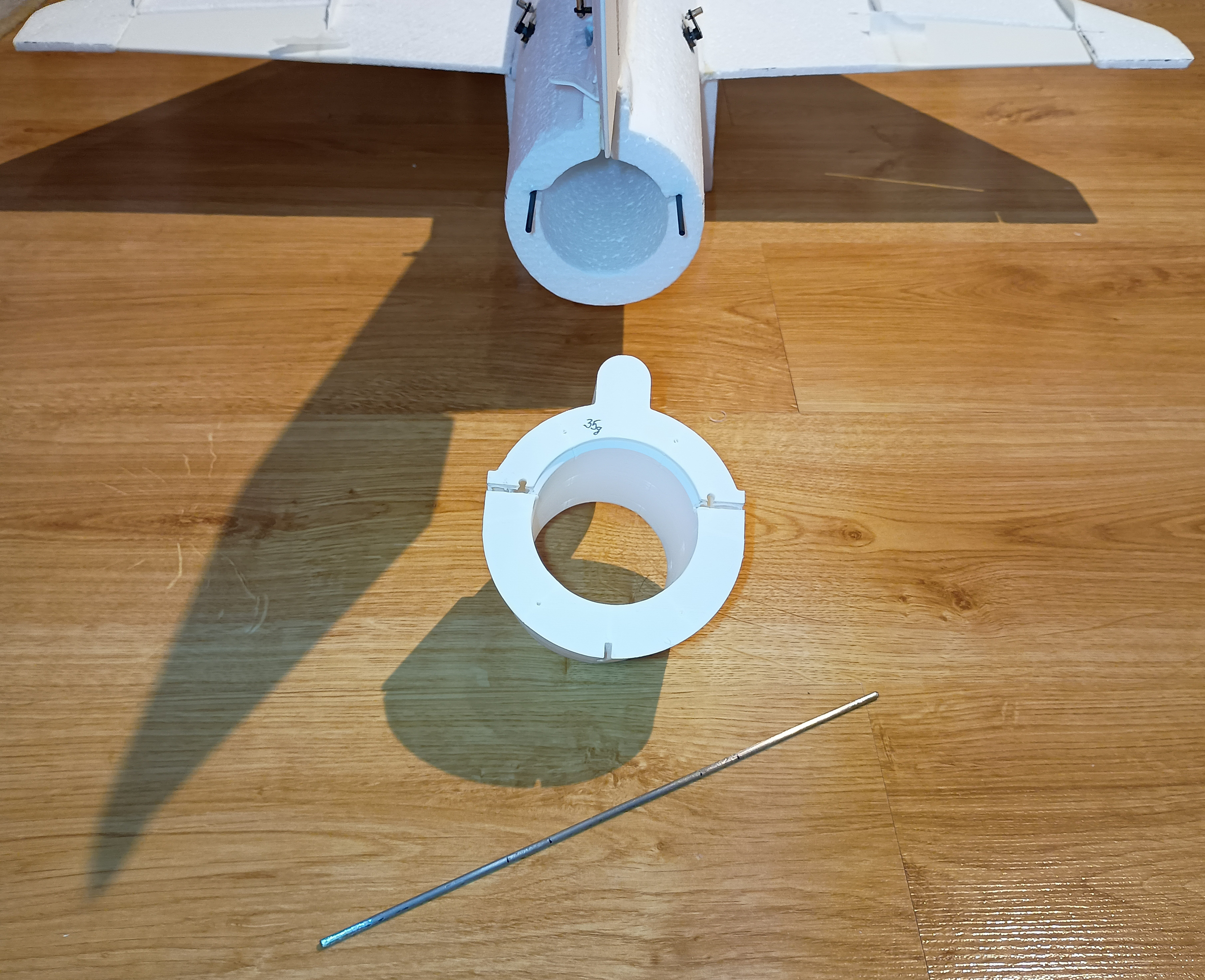 Zaprojektowałem stelaż wewnętrznej struktury... wydrukuję i zobaczę jak wyszło... Dwie rurki poliwęglanu fi3 jako podłużnice. Skrzydło na dźwigarze przednim rurka fi3 i głównym rurka fi6. Wręgi z PET-G, tak samo mocowanie turbiny. Pokrywa dolna turbiny z LW PLA. "Kładki" dla akumulatora i osprzętu ze szpatułek lekarskich.