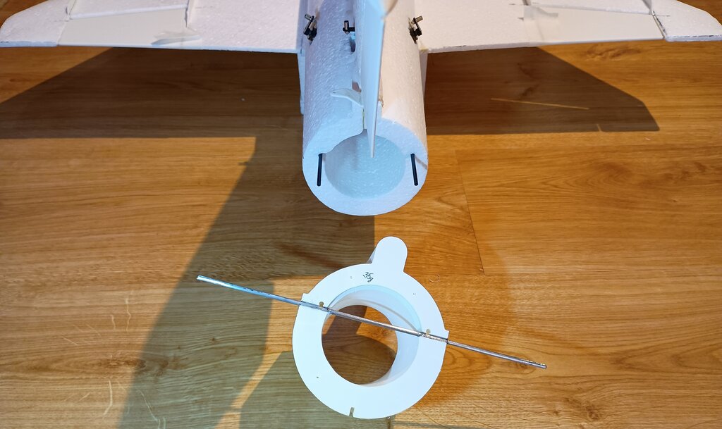 Troche czasu było i MIG dostał ogon. Statecznik pionowy wyciąłem ze styropianu, cały główny profil. Z lenistwa ster kierunku będzie wydrukowany. Podobnie szpic na szczycie steru kierunku. Oś steru stanowi wklejona w górny szpic oś z drutu oraz dolny zaczep "L" wklejony w styropian. Ster ma wewnątrz kanał dla osi. Nakładam ster na dolny zaczep i wklejam górny szpic... ster zamontowany. Potem to już z górki.... ster wklejam do kadłuba... Troche szlifowania i szpachli by były ładniejsze przejścia przykadłubowe... I można już wyciąć miejsce na serwo steru kierunku i wkleić serwo... Ster był troszkę wiotki, więc po obu stronach wkleiłem płaskownik węglowy 4x0.5 i teraz jest sztywny Mogę teraz wpasować moduł dyszy, zawiera on oś steru wysokości, obu połówek. Za radą kolegów oś zrobiłem z drutu stalowego fi3. Oś wklejam w moduł dyszy. Lutownicą robię kilka otworów w ściance modułu dla lepszej penetracji kleju. i sklejam Na oś prosto nasuwa się połówki steru wysokości, oczywiście obie są niezależne. Z jednej strony na osi umieściłem podkładkę separującą ster od kadłuba by nie ocierał a z drugiej jest zaciskowa obrączka. Złożone, wyznaczone miejsce obrączki i wykonałem spłaszczenie pod brok. Do kompletu brakuje dolnej płetwy ogonowej... właśnie się robi... c.d.n.