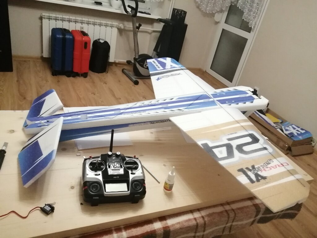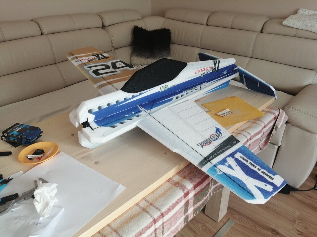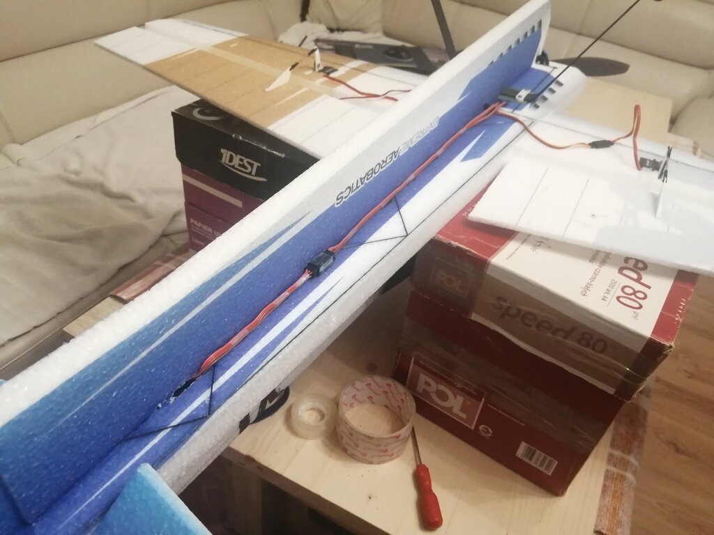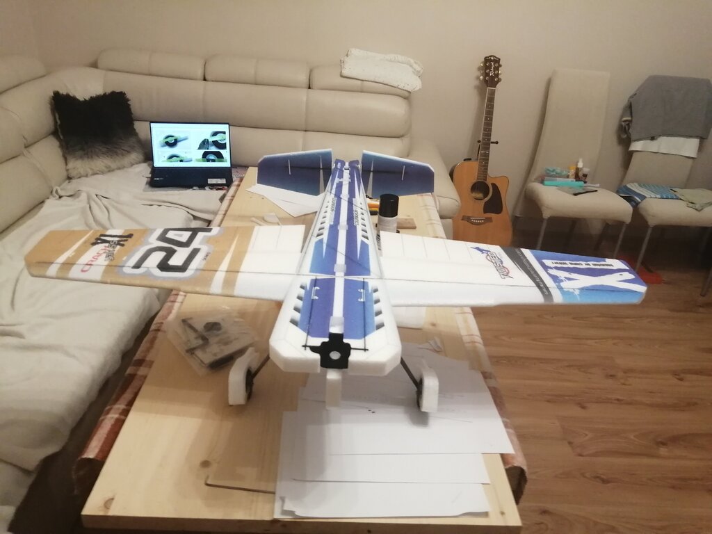 Przejściowa przy regulator ze jest na test bo nie mam teraz złącza do przy lutowania i muszę kupić. Co do akumulatora to wiem że są trochę duże, ale takich mam 5 i chcialbym latać na nich, ale jeżeli model będzie latał ociążale to kupię pakiety 1300mah. Kołpak kupiłem i założyłem dla lepszego wyglądu, ale jeśli model wyjdzie więcej niż te około 800 gram to go zdejmę. Serwa które kupiłem mają taki kształt, że z dokładnym powiększeniem orczyka (dawanym przez producenta) nie mogą się wychylić więcej niż 100% (nie da rady powiększyć wychyleń np. do 120%, chyba że się wypiłuję lekkie wgłębienie w przedłużce orczyka). Muszę znaleźć wychylenia zalecane przez producenta. Stworzę sobie 3 fazy lotu: -do startu i ładowania z małymi wychyleniami, -z średnimi wychyleniami, -z maksymalnym wychyleniami zalecającymi przez producenta. Ja zamontowałem regulator na dole i pakiet i odbiornik również tak raczej będzie. Akumulator zrobię chyba przechodzący przez kadłub. Wizualnie mi też się podoba i mam taką nadzieję, że na tych pakietach też będzie dobrze latać. W internecie widziałem jak ludzie latali tymi modelami na 2200 i nie wydawał się model w locie ociążaly. Może trzeba będzie latać na wyższych obrotach, bo waga będzie wyższa. Założyłem te kapcie na koła, ale na razie jak będę startował z ziemi to je raczej zdejmę. Jak będę ładował do ręki to może wtedy je założę, ponieważ mi się podoba ich wygląd. Załączam kilka zdjęć: -