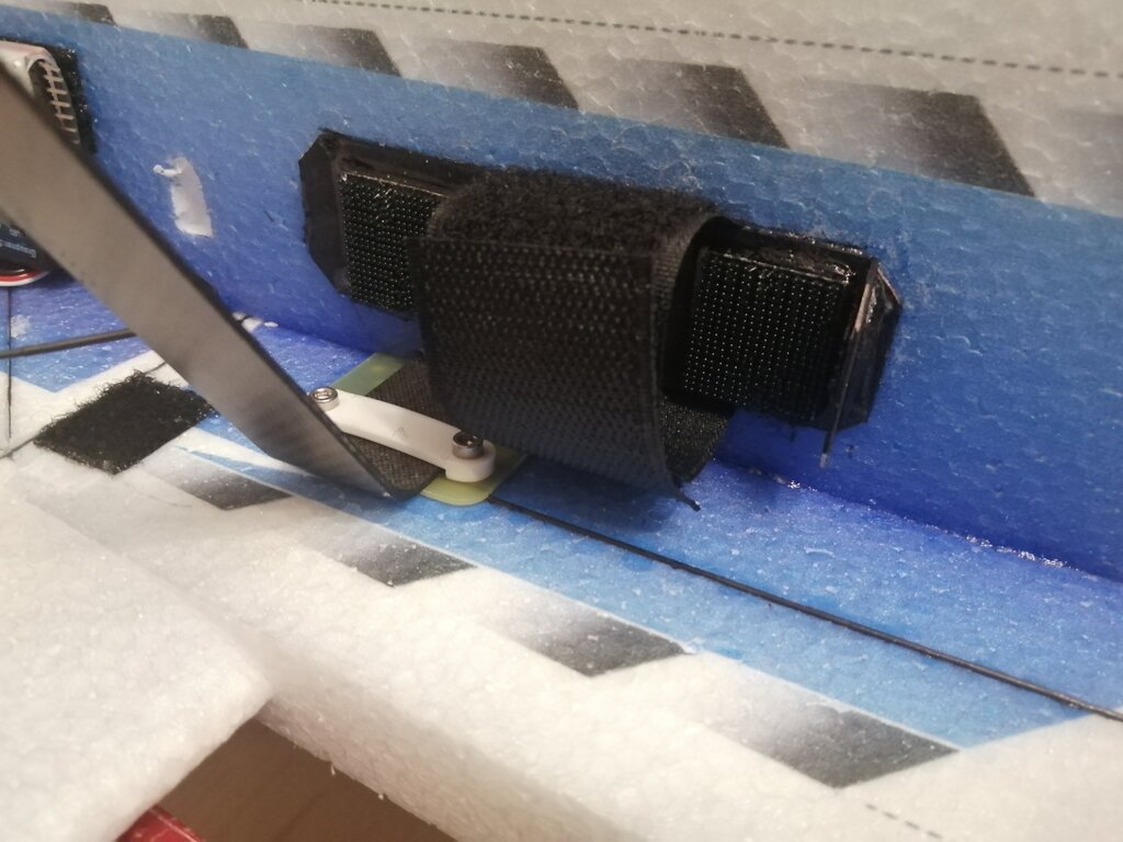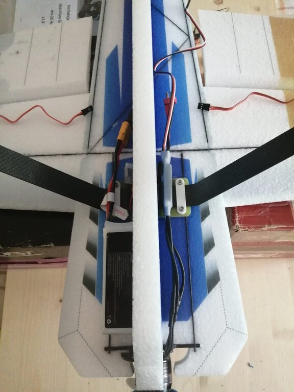 Też o tym myślałem. Jeszcze nie wiem jak zrobię. Plus wycięcia pianki jest taki, że akumulator jest już trochę trzymany przez piankę oraz rzep. Ile waży twój model do lotu z pakietem? -