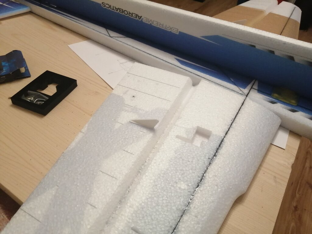 III dzień prac: Dzisiaj trochę mniejszy postęp: - wkleiłem serwo od kierunku, ale jeszcze steru nie - serwa od lotek, również już są w modelu Bardziej czasochłonne rzeczy, to właśnie elektronika, bo to trzeba samemu odpowiednio dopasować i przymocować. Pozostało wklejenie steru kierunku oraz zamontowanie silnika i regulatora. Całą elektronikę chcę zamontować na rzep dual lock, oraz dodatkowo normalny rzep. Mocowanie pakietu muszę jeszcze przemyśleć, aby nie musieć go dowarzać. Jeśli nie będą pasować dokupię 1300mah. Muszę jeszcze dokupić przedłużacze do serw. Jak Wy mocowaliście elektronikę w modelu? Tzn. do góry czy na dole? Mógłbyś Wiesiek wysłać zdjęcie jak tym umieściłeś całą elektronikę w modelu? Pakiet, regulator i odbiornik dałeś u góry? Oto kilka zdjęć z postępu budowy z dzisiejszego dnia: Na razie jeszcze mam czas do tej decyzji jaki model wybiorę. Jak sprawdzałem długość 2,2m to około 2m więc może byś problem. Widziałem, że ktoś na imac miał dzielony kadłub, i przewoził 3,2m w suwie. Nie wiem jak wpływa to na wytrzymałość, ale jak tak duży model do akrobacji był dzielony, to musi być wytrzymałe. Raczej był to model kupiony od razu dzielony. Niektórzy odkręcali na imac śmigła, kołpak i część ruchomą steru kierunku, i wtedy mają krótszy model o około 20-30cm. -