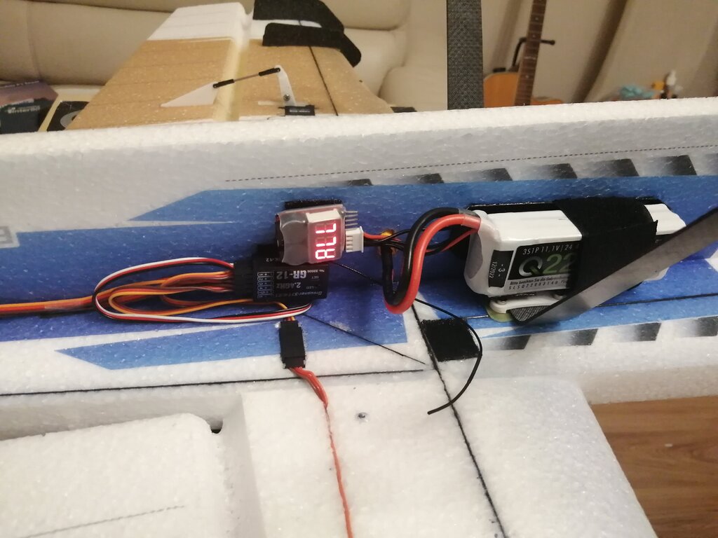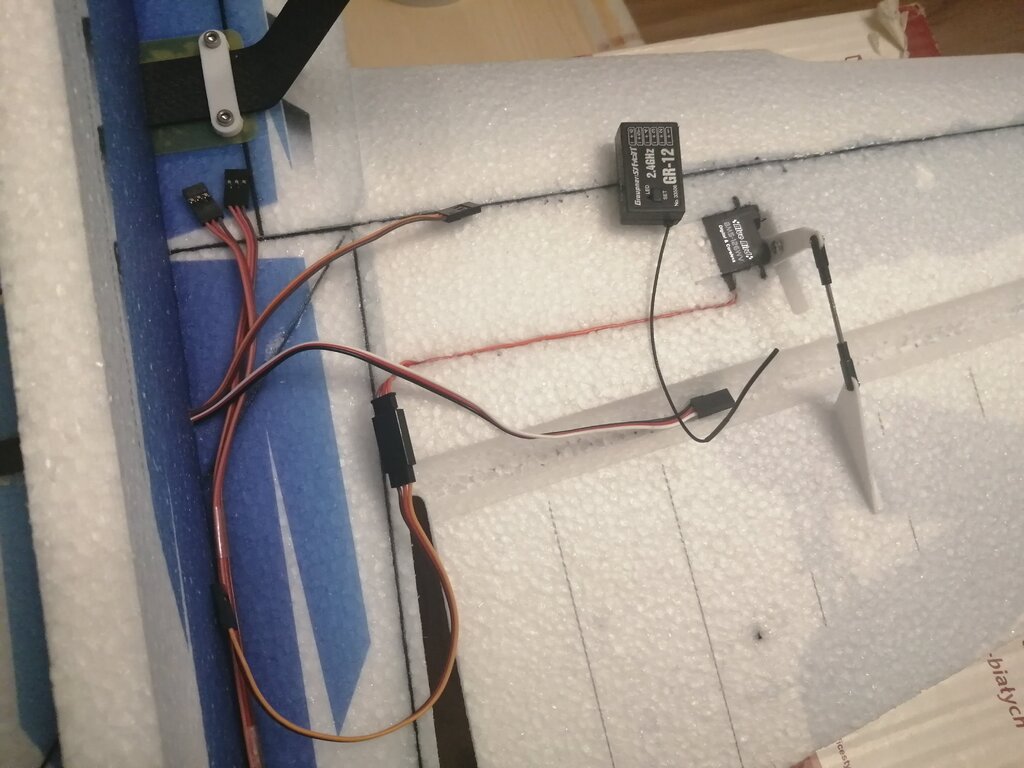 V dzień już ostatni, dzisiaj zrobiłem - mocowanie odbiornika - mocowanie wszystkich kabli - mocowanie pakietu, oraz sygnalizatora napięcia - zdjąłem kapcie na koła, bo u mnie na lotnisku się nie sprawdzą - przykleiłem pozostałe elementy skrzydła - zrobiłem fazy lotu z różnymi wychyleniami Przetestowałem wszystko i nie ma żadnych problemów. Mocowanie pakietu jest solidne: - na 2 rzepu typu dual lock - jest 4 cm pasek z rzepu krawieckiego - półka na pakiet na też blokadę, aby się nie przesunął do przodu. Jutro jeszcze nakleję taśmę na krawędź natarcia, ponieważ jest dość miękka i nie chciałbym aby się uszkodziła. Model już czeka na dobrą pogodę i wolny czas do oblotu. -