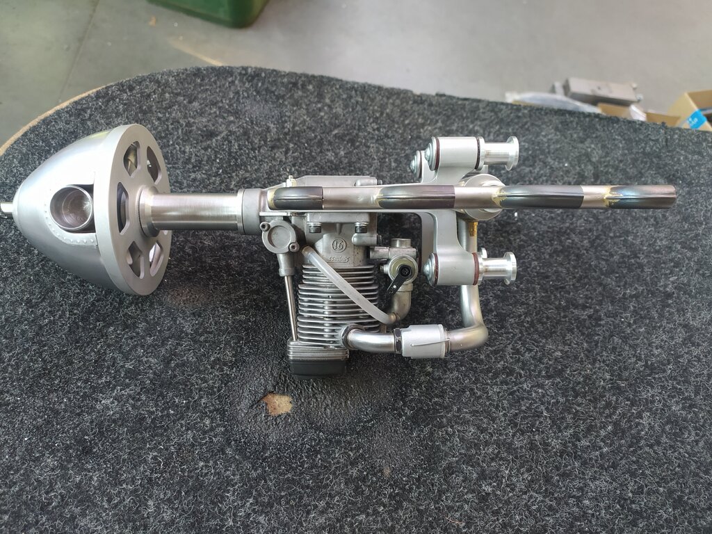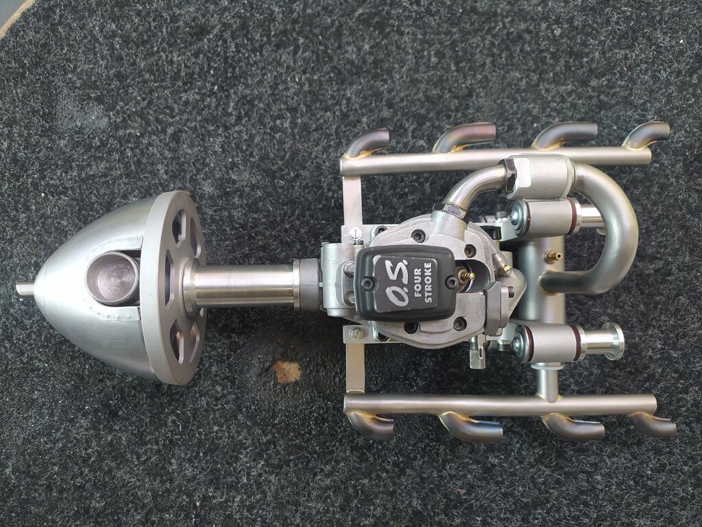 Produkcja żelastwa, ciąg dalszy. Podwozie składane pneumatycznie już gotowe, nadszedł czas na silnik i jego modyfikacje. Wydech wykonany z rur nierdzewnych przetaczanych do ścianki 0.5mm końcówki wydechu że zwykłej blachy 0.5mm składane z dwóch połówek celem uzyskania charakterystycznego garba. Całość lutowaną ma srebro i okopcona palnikiem. Czekam teraz na korozję na końcówkach... Przedłużona piasta żeby wszystko ładnie schować. Kołpak i śmigło redukcyjne... Model ma być hybrydą na radio i na uwięzi. Zastanawiam się teraz nad zbiornikiem. I tu pytanie do kolegów modelaży, czy zbiornik z przodu silnika w kształcie pierścienia nakładany na piastę to dobry pomysł? Z obliczeń wychodzi mi jakieś 350ml. Co o tym myślicie?