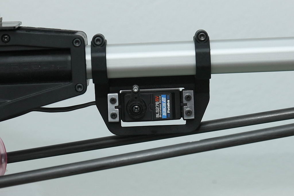 Etap 2 - montaż dolnej ramy. W ramie dolnej montowany jest silnik oraz zbiornik paliwa. Jej elementy przedstawia zdjęcie poniżej. Najpierw zamontowałem w obu połówkach ramy gumowe amortyzatory trzymające zbiornik paliwa. Takie elastyczne zawieszenie zbiornika w znacznym stopniu eliminuje pienienie się paliwa od wibracji. Następnie zmontowałem zbiornik paliwa. Ssak (filcowy) zawieszony jest na stosunkowo cienkim i elastycznym, neoprenowym przewodzie paliwowym. Do jednej połówki ramy tymczasowo przykręciłem metalową tulejkę. Do tej połowy dolnej ramy tymczasowo przykręciłem ramę serwomechanizmów. W tak przygotowanej ramie umieściłem zbiornik paliwa. Trzeba zwracać uwagę, aby gumowe amortyzatory znalazły się w specjalnych zagłębieniach w zbiorniku i się nie pozaginały. Teraz można było założyć drugą połowę dolnej ramy i tymczasowo skręcić całość. Tak przygotowaną kompletną ramę należy postawić na równej powierzchni i sprawdzić, czy jest prosta. Bardzo drobne korekty możliwe są po poluzowaniu śrub mocujących obie ramy. Większe korekty w modelach Hirobo nie występują. Jeśli wszystko jest OK to całość skręca się na gotowo z użyciem Loctite. Na koniec tego etapu prac zamontowałem dolne łożysko wału głównego wraz z uchwytem. Tu trzeba zwrócić uwagę, aby wszystkie trzy łożyska wału były zamontowane osiowo. W ten sposób mamy zmontowaną kompletną ramę mechaniki modelu. Etap 3 - pasowanie ramy mechaniki z kadłubem makiety. Producent makiety podał szczegółowe wymiary otworów montażowych do zamontowania mechaniki Freyi. Powierciłem je i sprawdziłem, czy mechanika pasuje. Następnie wkleiłem w kadłub specjalną sklejkową podkładkę, zapewniającą odpowiednie pochylenie mechaniki i wirnika w stosunku do makiety. Następnie założyłem górę budki. Założyłem chwilowo tarczę sterującą i wał główny, aby sprawdzić czy pasują otwory w górnej części laminatowej budy. Jak widać jest dobrze. Etap 4 - tarcza sterująca. Element ten umożliwia zmianę skoku okresowego (przechył i pochył) i ogólnego (siła siągu - wznoszenie / opadanie modelu) wirnika głównego. Składa się z dwóch pierścieni połączonych łożyskiem. Pierścień zewnętrzny jest nieruchomy, a wewnętrzny obraca się razem z wałem głównym. Pomiędzy pierścieniem wewnętrznym a wałem znajduje się łożysko wahliwe. Dzięki niemu możliwa jest zmiana płaszczyzny tarczy sterującej względem wału. Kula tego łożyska pracuje względem wału również jako łożysko ślizgowe. Dzięki temu tarcza może przesuwać się wzdłuż wału. Tarcza przychodzi zmontowana. Należy jedynie przykręcić we właściwych miejscach odpowiednie kulki snapów. Etap 5 - głowica wirnika głównego. Chyba najważniejszy i najbardziej charakterystyczny element śmigłowca. Zaczynamy od montażu centralnej części głowicy (yoke) z tuleją umożliwiającą montaż całości na wale głównym (center hub). Dzięki łożyskom i tulejom gumowym połączenie to jest w pewnym stopniu elastyczne. Przez dobór odpowiedniej twardości tulejek gumowych możemy dobrać według uznania charakterystykę głowicy - "miękkość" sterowania. Powyżej widoczny jest zamontowany wałek poprzeczny okuć łopat głównych - tak zwany szpindel. Następnie montowane są okucia łopat. Każde okucie posiada podwójne łożyskowanie oraz dodatkowo łożysko czołowe. Mając przygotowaną główną część głowicy można zamontować element "seesaw". Umożliwia on instalację pręta i ramki stabilizatora oraz ramion miksera. Dzięki zastosowanym łożyskom pręt stabilizatora z ramką może obracać się w "seesaw" wokół własnej osi podłużnej, a razem z "seesaw" jest zamontowany wahliwie w stosunku do wału głównego i " central hub'a". Przez to płaszczyzna wyznaczona wirującym prętem stabilizatora nie zawsze jest prostopadła do wału. Na "seesaw" zamontowane są dwie dźwignie miksera. Na nich miksowane jest sterowanie łopatami pochodzące bezpośrednio z tarczy sterującej oraz stabilizatora (pręt + łopatki + ramka), będącego mechanicznym żyroskopem stabilizującym model w osiach przechyłu i pochyłu. "Seesaw" umożliwia zamontowanie ramion miksera w różnych odległościach od wału głównego - im dalej od wału tym łagodniejsze sterowanie i lepsza stabilizacja. Ja używam ustawień średnich. Następnie można zamontować ramkę i pręt stabilizatora. Ramka łączy pręt z tarczą sterującą za pomocą kompensatora skoku ogólnego (miksera "washout") umożliwiając zmianę płaszczyzny wirowania pręta stabilizatora. Końce pręta stabilizatora muszą być w jednakowej odległości od wału głównego. Do tak przygotowanej głowicy można zamontować łopatki stabilizatora. Należy w nich umieścić według uznania ciężarki. Cięższe łopatki (i / lub dłuższy pręt stabilizatora) to większy moment żyroskopowy i lepsza stabilizacja modelu. W obu łopatkach ciężarki muszą być takie same. Łopatki mają profil symetryczny. Przykręca się je tak, aby ich kąt natarcia był zerowy w stosunku bo płaszczyzny wyznaczonej przez ramkę stabilizatora. Odległości między łopatkami, a ramką muszą być takie same. Ostatnim etapem montażu kompletnej głowicy jest założenie cięgien / popychaczy sterujących pomiędzy okuciami łopat a ramionami miksera i między ramionami miksera a tarczą sterującą. Ten drugi zestaw cięgien na razie zakłada się tylko na ramiona miksera - połączenie z tarczą wykonuje się na etapie montażu całości na wale głównym. Etap 6 - kompensator "washout". Ponieważ łopatki stabilizatora nie mają możliwości niezależnej zmiany skoku i tym samym nie może się zmieniać ich skok ogólny, a zmieniana jest tylko płaszczyzna wirowania stabilizatora w ramach skoku okresowego, niezbędny jest mikser mechaniczny "gubiący" ruch tarczy sterującej wzdłuż wału głównego. Ten mikser to właśnie kompe