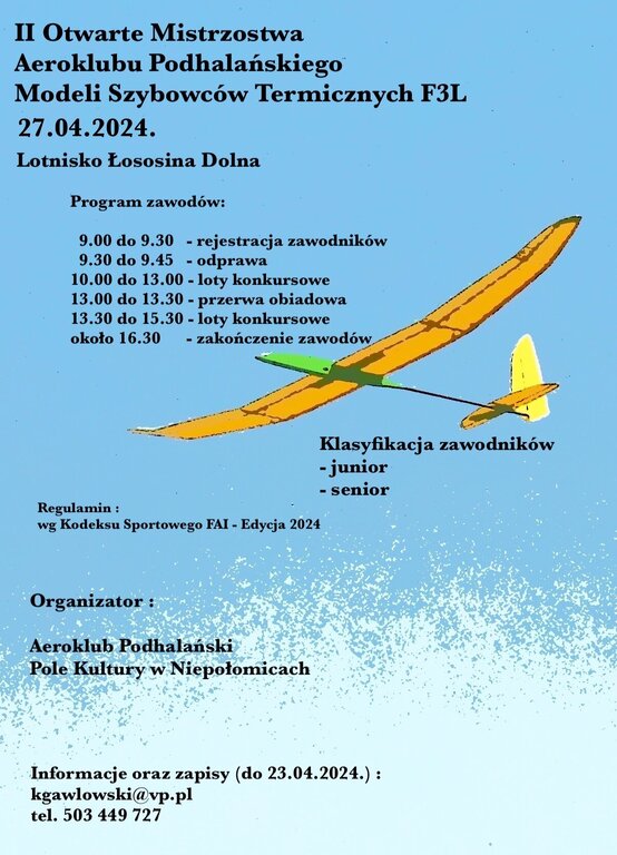 Poniżej zamieszczam w wersji Pl. tymczasowy regulamin klasy F3L - szybowców termicznych sterowanych radiem RES, ze zmianami wprowadzonymi w kwietniu ub.r. przez CIAM - wydaje mi się że nic nowszego nie ma, bo zmiany wprowadzają podobno na posiedzeniu CIAM raz do roku. Jeżeli ktoś dopatrzy się jakiś poważniejszych błędów, to będziemy zmieniać tekst. W regulaminie nic nie ma o wielkości chorągiewki. Wydaje mi się, że trzeba używać sprawdzonych, jakich od lat używają inni. W Łososinie cały sprzęt pochodził z zakupów w sklepach, które specjalizują w F3L. Między żyłką a gumą warto wpinać "łożyskowane"agrafki, które zapobiegają skręcaniu się żyłki i gumy. 2023-grudzień,F3L - regulamin KG.docx -