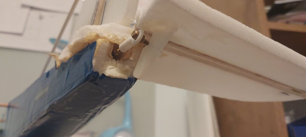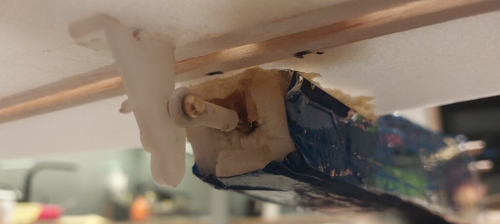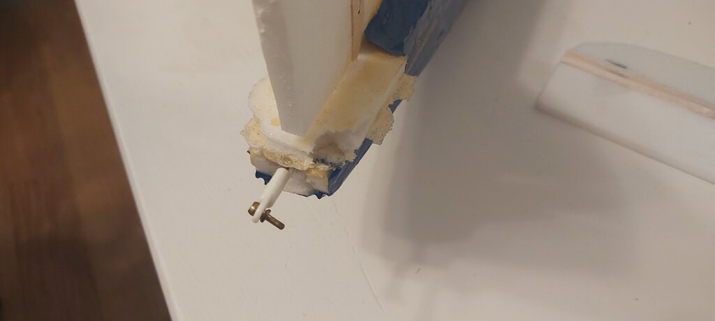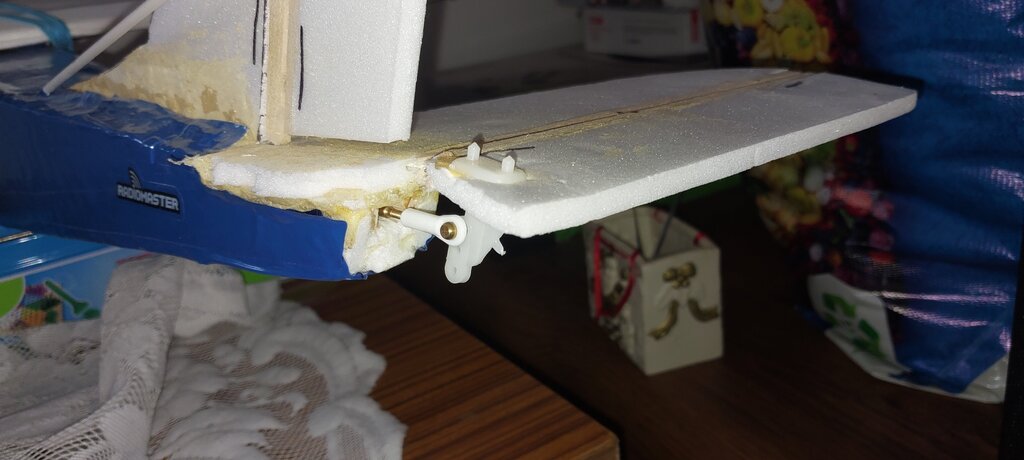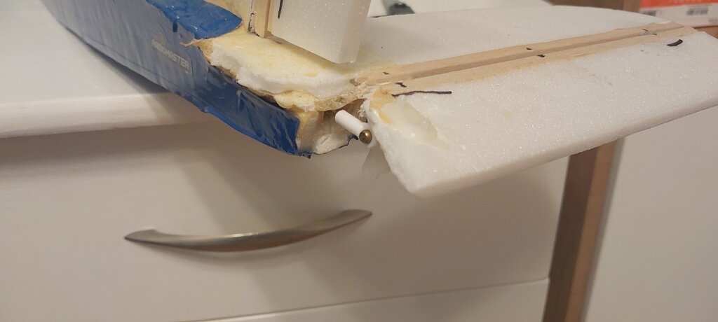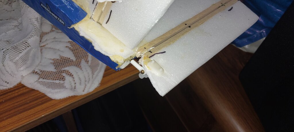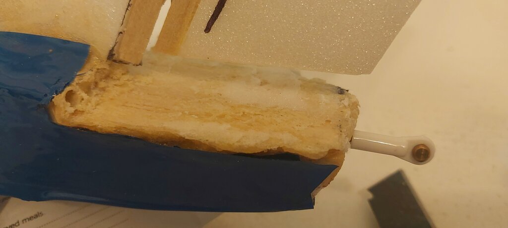 Dziś dzień drugi odbudowy Po analizie jak wyciąć ster pierw postanowiłem odciąc jego prawą część tak by pozostał sam środek. Później wyciąłem resztę steru i wyczyściłem go ze starych kleji. Po wyczyszczeniu [nie dałem zdjęcia po wyczyszczeniu zapomniałem zrobić ]zaczepiłem do lotki element popychacza Po tem wkleiłem gotowy element