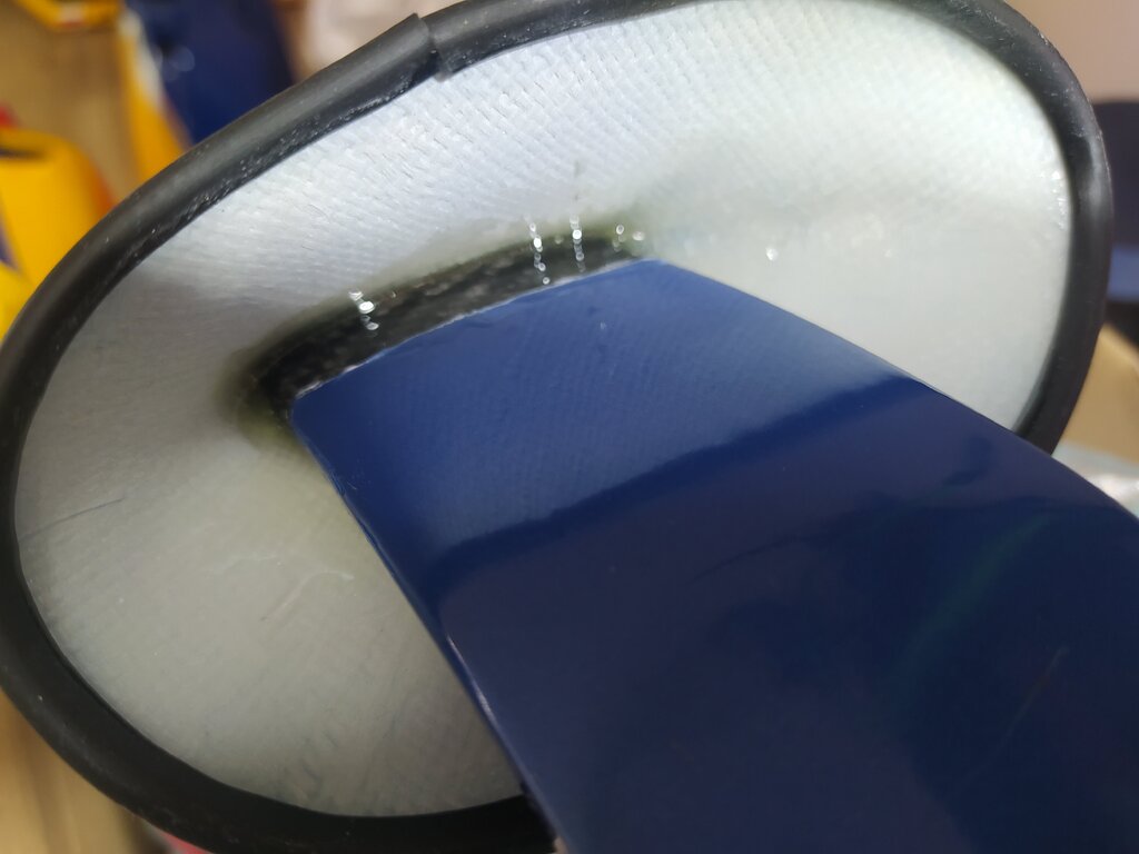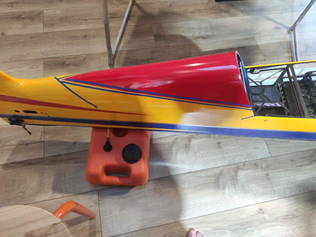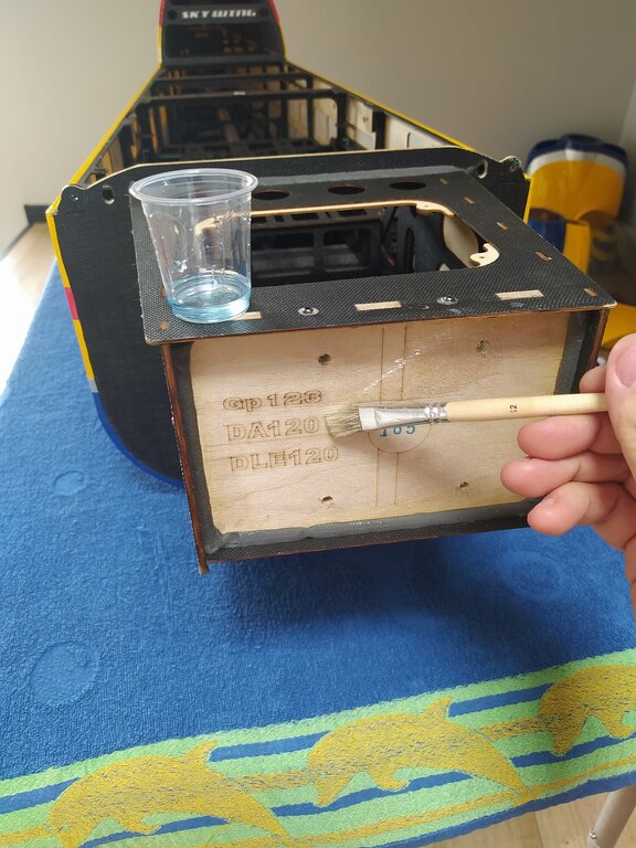 Idąc dalej z budową... Kolejną rzeczą którą robimy jest zabezpieczenie domku silnika rzadką żywicą L285. Dzięki temu domek nie pochłania rozlanej benzyny czy oleju. A jak zostaje nam trochę żywicy to wykorzystujemy ją do uzupełnienia łączeń wewnątrz kadłuba Maska tego modelu jest świetnie zrobiona i po raz pierwszy spotkaliśmy się z zaprojektowaną już tzw. wargą, której zadaniem jest obijanie strug powietrza tak, aby nie wpadały pod wlot wykonany od spodu maski. W zestawie z modelem otrzymujemy 1000 ml zbiornik paliwa wraz z podstawką i rzepami do zamontowania go oraz przewodami paliwowymi, wlewem i odpowietrznikiem. Poniżej kilka fotek z pracy. -