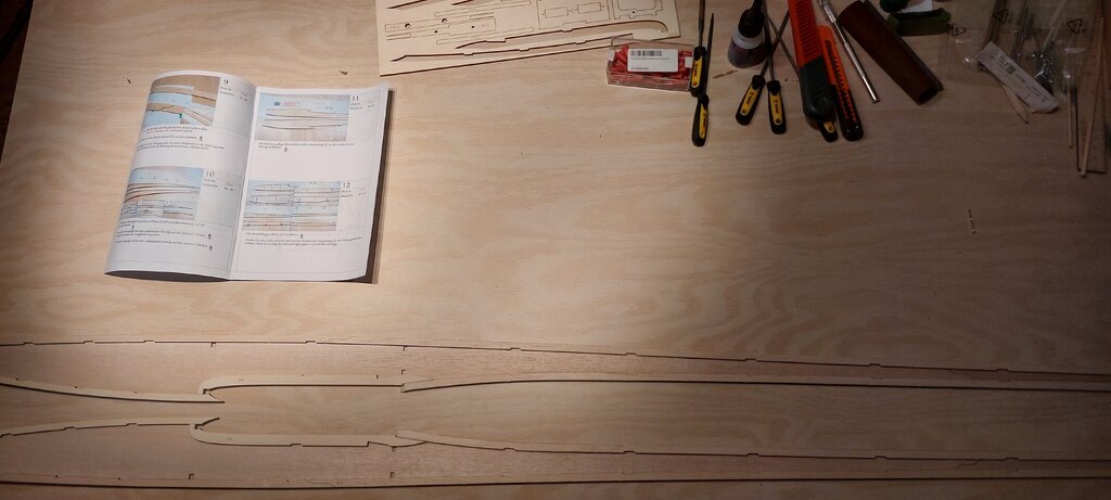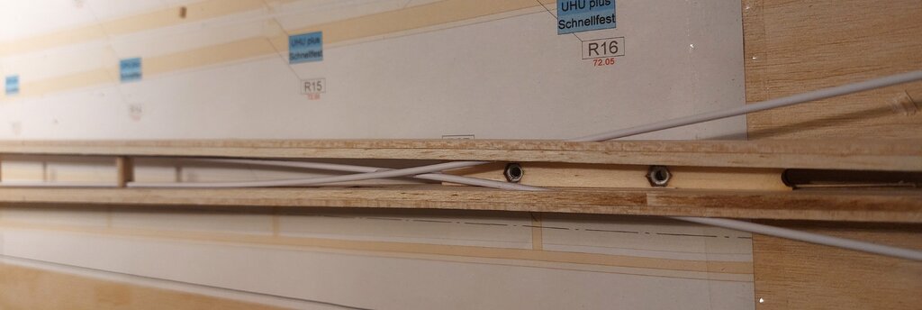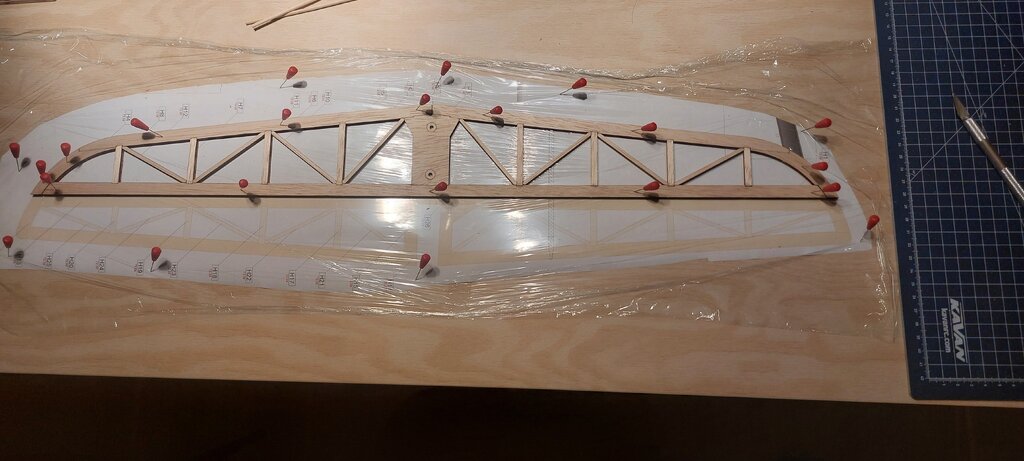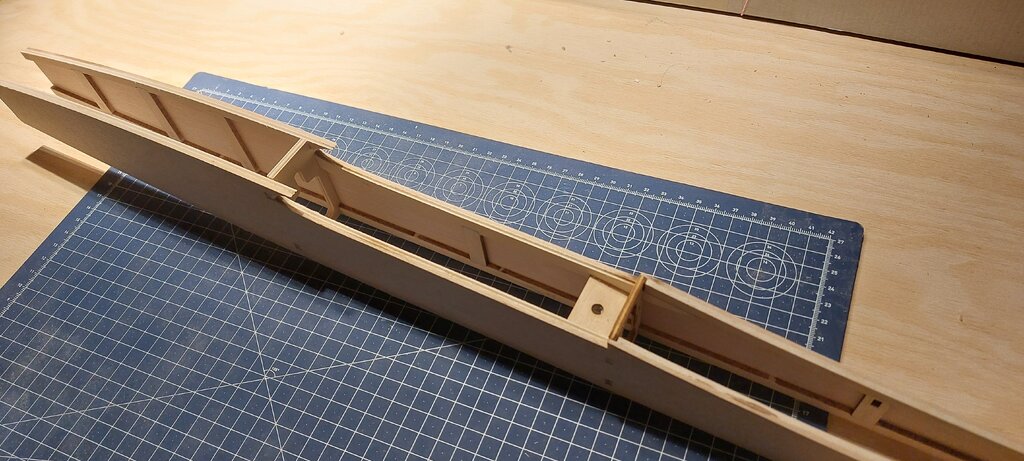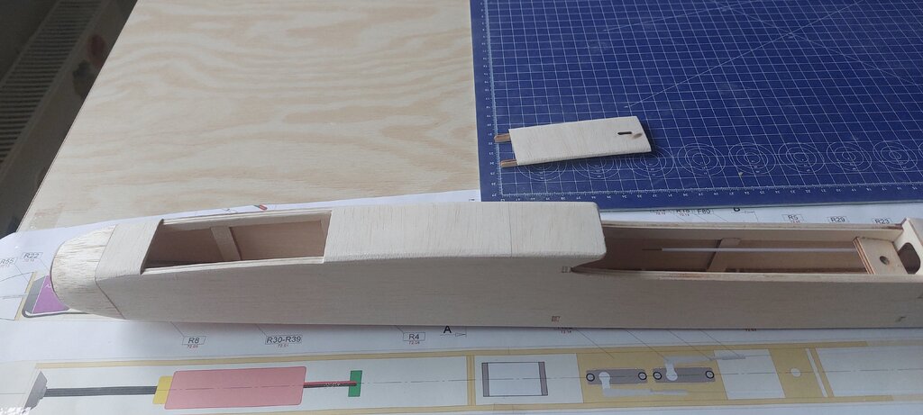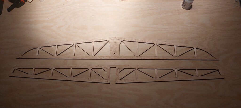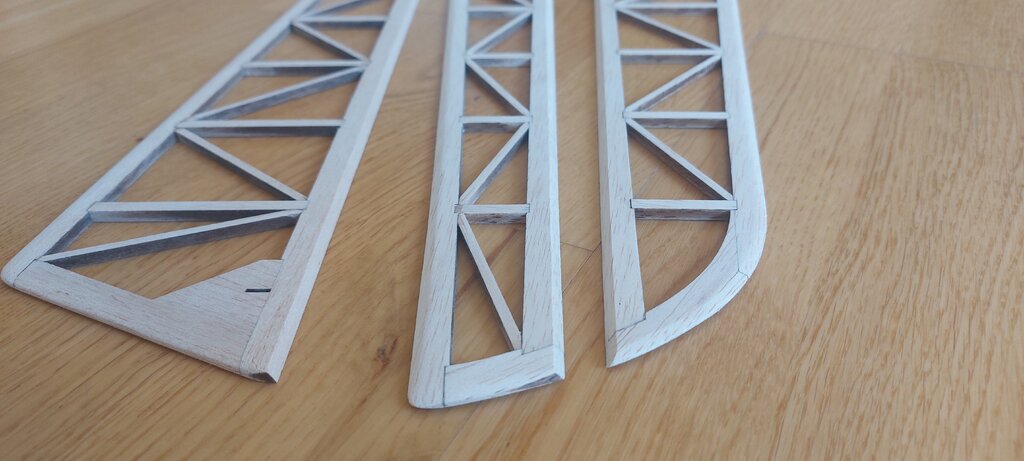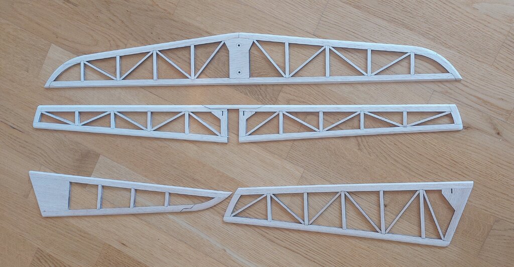 Wszystkich widzów uspokajam- temat nie został porzucony! 😇 Składanie powoli postępuje, ale pewne tego efekty zaczynają być widoczne 1. Stateczniki przygotowane do pokrycia. Całość bez dźwigienek i śrub mocujących wyszła 50g 2. Wklejone łączniki 3. Płat i kadłub gotowe do pokrycia. Oba uszy wyszły równo po 116g sztuka, a różnica we wzniosie na końcówkach to ok 1mm (w zależności ok oka mierzącego ) - przyjmuję ten wynik z satysfakcją. Centropłat- 146g Na tym etapie, całość jest gotowa do pokrywania folią. Tutaj bez zaskoczenia, będzie to Oracover- instrukcja podpowiada, aby rozpocząć pokrywanie przed montażem serw i przeciągnięciem kabli. Zastanawiam się tylko, czy nie proście byłoby tego zrobić przed pokryciem? 🤔