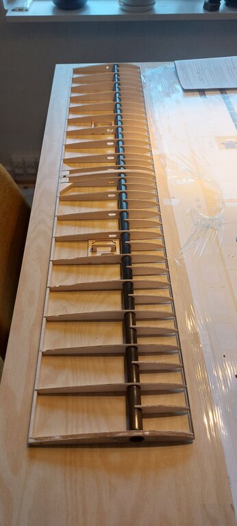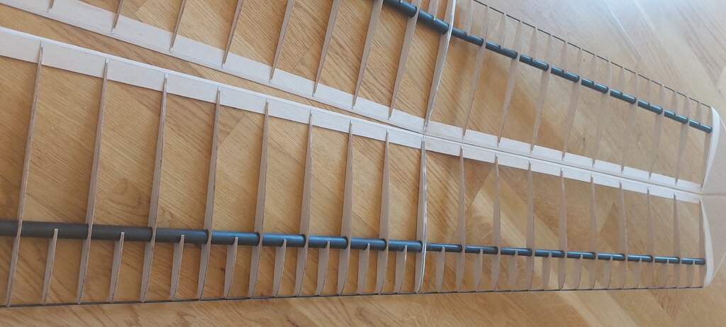 Update pogodowy: Centropłat gotowy- bez większych zaskoczeń, bo i konstrukcja nie jest skomplikowana Przy okazji przycinania końcówek dźwigara, przypomniałem sobie, że węglowe rury rzeczywiście są wytrzymałe 😆 Piłka do metalu i odrobina cierpliwości jednak załatwiły temat. Podoba mi się, że wszystko, co możliwe, jest wykonane z balsy/ sklejki, również ramki na serwa. Krawędź spływu będą stanowiły frezowane lotki z balsy wykonane w całości z jednego fragmentu materiału.