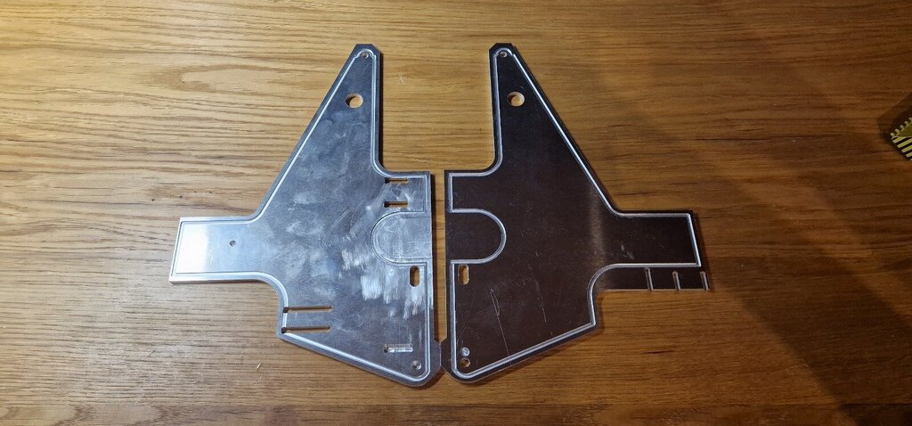Po wielu trudnościach udało się wyciąć pierwsze elementy z aluminium. Jednym z założeń projektu jest jak najmniejsza pomoc z zewnątrz. Dlatego płyty będą ze sobą klejone. Wykonałem już testy. Rozdzielenie sklejonych elementów gołymi rękoma jest w zasadzie niemożliwe. -