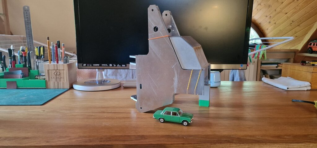 Powoli rośnie i sama ładowarka. 125p w 1:43,5 dla porównania skali. Opona w fazie projektu. Aluminium klejone za pomocą kleju od Ataszka. Trzyma nieprawdopodobnie mocno. -