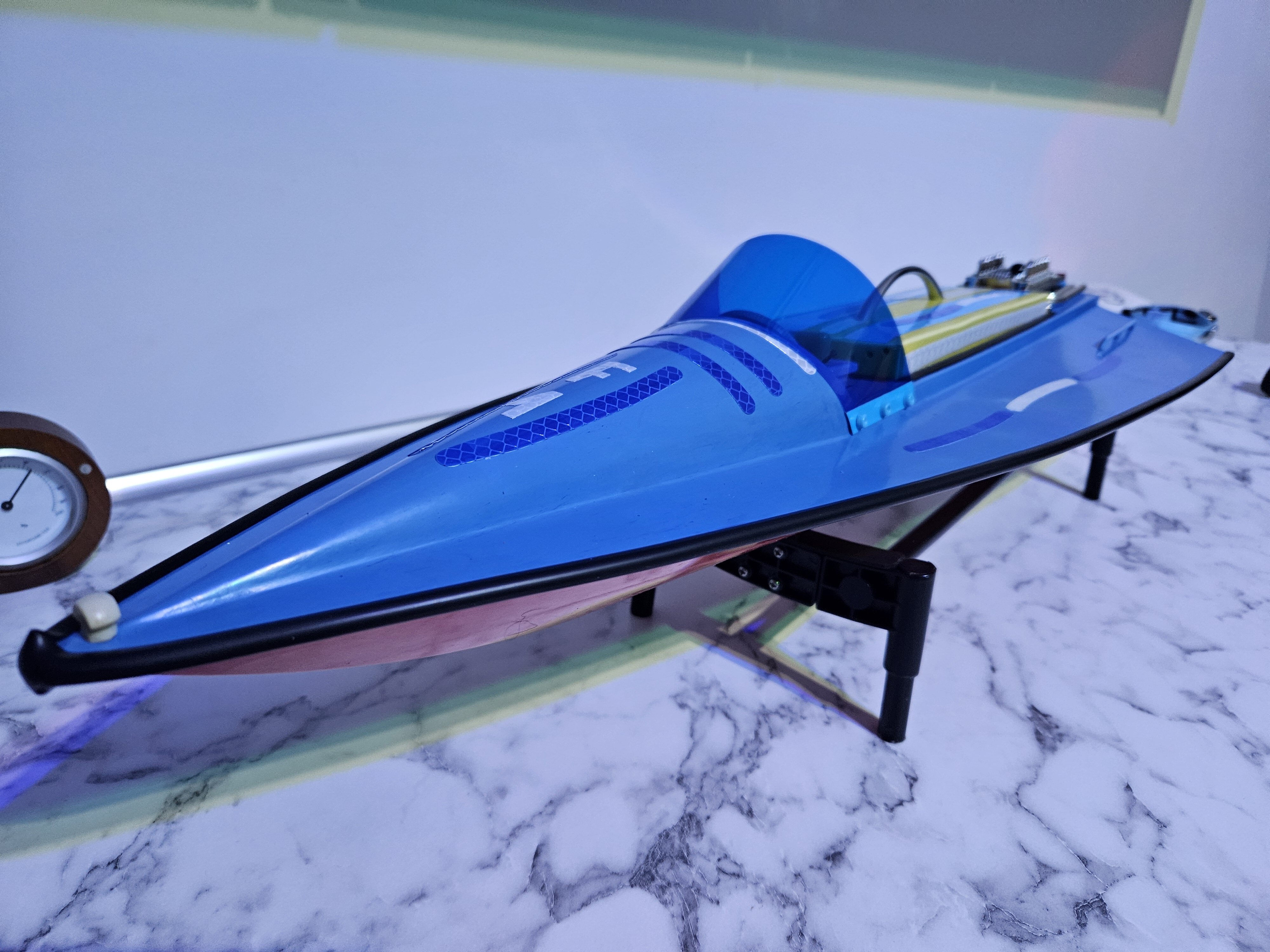 2 miesiące i wyszło coś takiego. Naprawdę pięknie pływa, choć żagle diabli wzięli.Taki sam los spotkał inny model z tego samego okresu. Na wyspisko i ??? Miał byczy silnik i Nicd, teraz ma bezszczotkę i polimery. Nawet kierownicą kręci razem ze sterem. Prawie nowe żagle chętnie oddam.