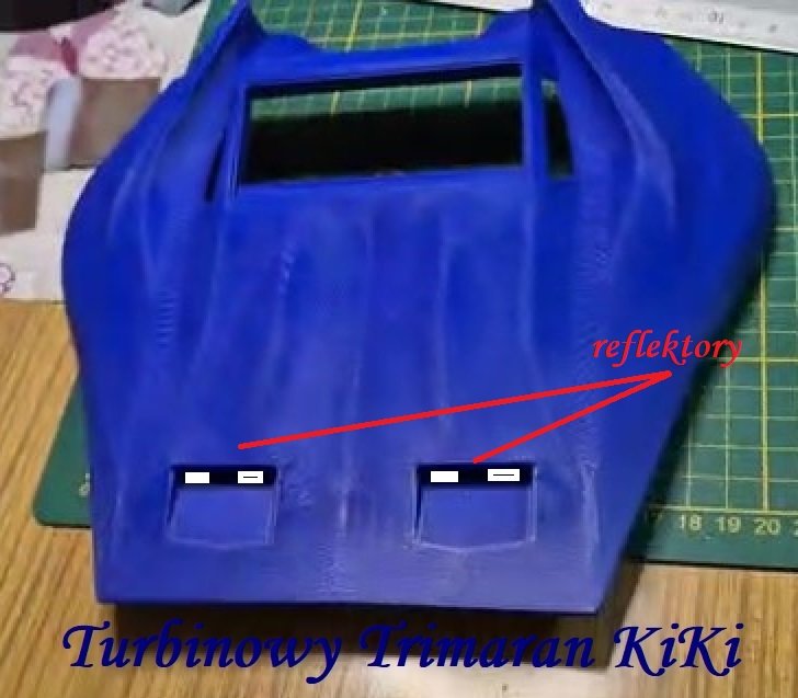 Wygląd i estetyka jednym z priorytetów. Przeprojektowana nadbudówka do montażu reflektorów 2x2 z zamienną opcją 4 jasnych diód led..W rufie pomarańczowa obrotowa dioda. Przewidziany też włącznik zasilania Trimarana oraz port zewnętrznego ładowania LiPo, aby nie ściągać za każdym razem górnego pokładu. Przewidziane 3 opcje sterowania. 2 na bocznych pływakach, za środkowym kadłubem i za turbiną. Wybór po fazie prób. Gyby zaszła potrzeba montażu napędu podwodnego, najlepszym rozwiąaniem byłyby opcja 1 lub 2. Wszystko bez szkody dla modelu. -