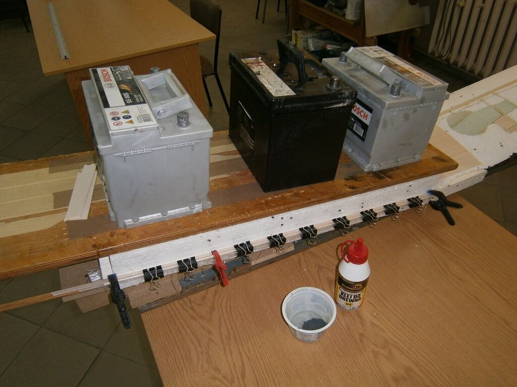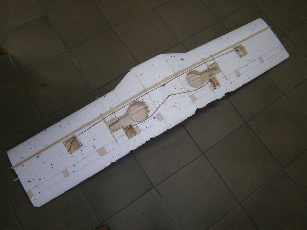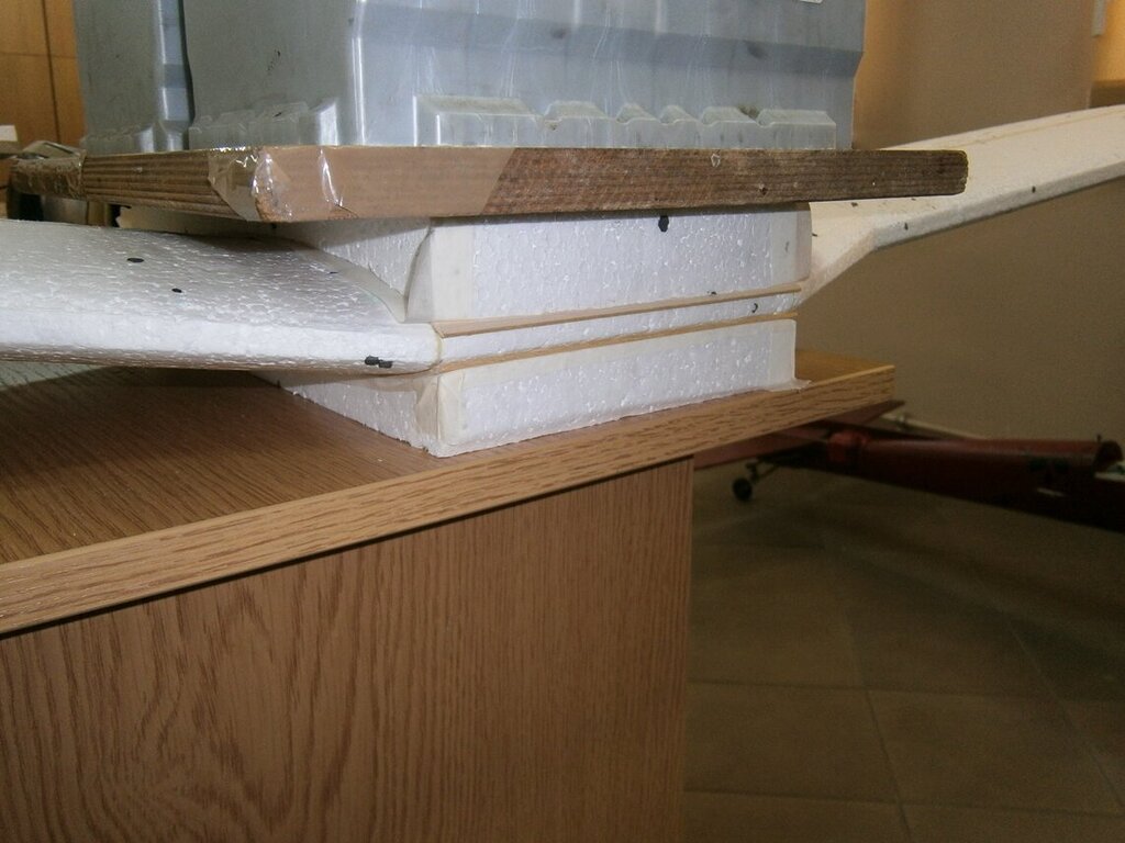 24. Witam Ja oklejam skrzydełka styropianowe balsą na Soudal. Sklejone formatki poszycia skrzydła gruntuję rozcieńczonym cellonem lub lakierem, klej nakładam cieniutko na formatki rozsmarowując np. starą kartą bankomatową lub inną i spryskuję nieco wodą. Wcześniej krawędź spływu posmarowana żywicą i naklejony kawałek tkaniny szklanej żeby utwardzić krawędź spływu, wszystko na świeżo. Nakładam posmarowane formatki na styropian i i dociskam całość wykorzystując negatywy po wycinaniu rdzenia. Tak zrobiłem skrzydła do Iskierki i elektroszybowca .