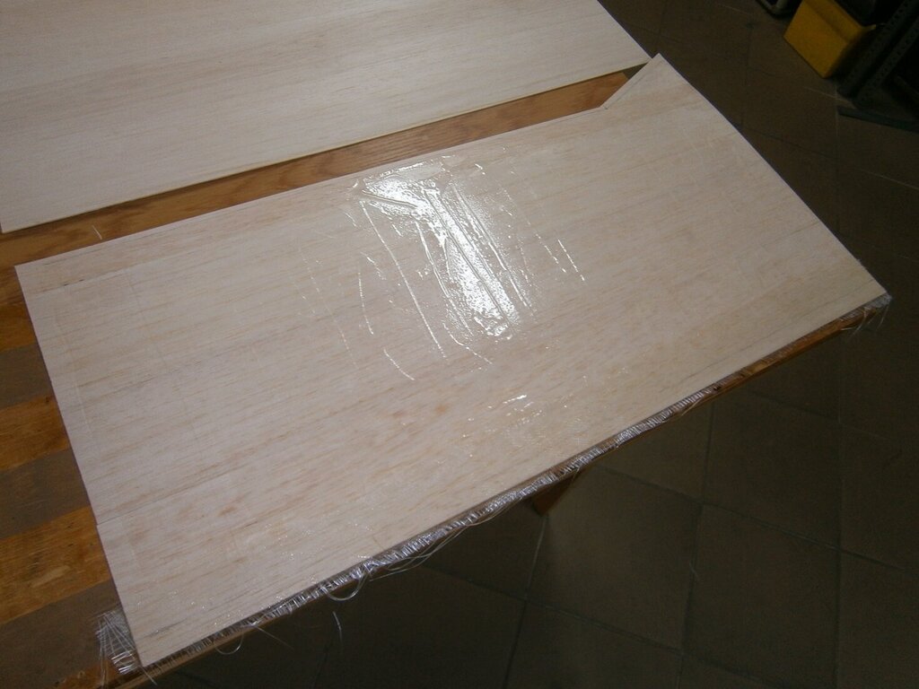 5. Witam Jedna połówka płata oklejona. Jak dla mnie materiał na pokrycie rewelacja. Po przyklejeniu cellonem zostało trochę nierówności ( podobnie jak przy japonie). Na twardym pokryciu wszelkie nierówność, zmarszczki wyrównałem żelazkiem i od razu uwaga, temperatura żelazka to co najmniej połowa tego co przy folii albo jeszcze mniej. Pozostałe pokrycie między żebrami naciągnąłem małą dmuchawą. Vlies jest na pewno ciekawą alternatywą do japonu. Wygląda podobnie a jest dużo odporniejszy na zerwanie szczególnie wzdłuż włókien. I tak trzeba oklejać, włókna materiału wzdłuż dłuższych krawędzi.