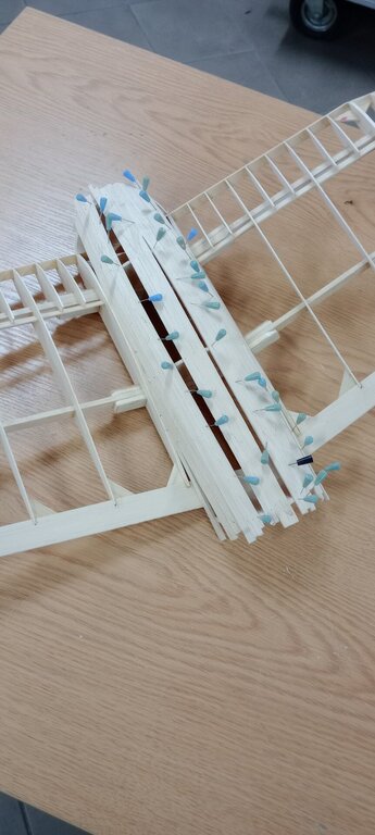Witam Ja oklejam skrzydełka styropianowe balsą na Soudal. Sklejone formatki poszycia skrzydła gruntuję rozcieńczonym cellonem lub lakierem, klej nakładam cieniutko na formatki rozsmarowując np. starą kartą bankomatową lub inną i spryskuję nieco wodą. Wcześniej krawędź spływu posmarowana żywicą i naklejony kawałek tkaniny szklanej żeby utwardzić krawędź spływu, wszystko na świeżo. Nakładam posmarowane formatki na styropian i i dociskam całość wykorzystując negatywy po wycinaniu rdzenia. Tak zrobiłem skrzydła do Iskierki i elektroszybowca .
