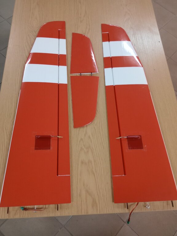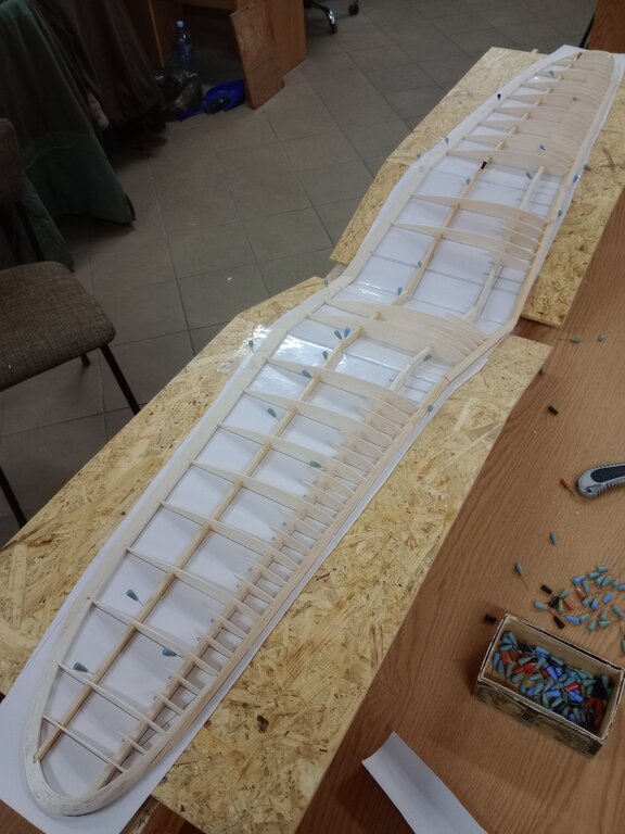 Witam Jedna połówka płata oklejona. Jak dla mnie materiał na pokrycie rewelacja. Po przyklejeniu cellonem zostało trochę nierówności ( podobnie jak przy japonie). Na twardym pokryciu wszelkie nierówność, zmarszczki wyrównałem żelazkiem i od razu uwaga, temperatura żelazka to co najmniej połowa tego co przy folii albo jeszcze mniej. Pozostałe pokrycie między żebrami naciągnąłem małą dmuchawą. Vlies jest na pewno ciekawą alternatywą do japonu. Wygląda podobnie a jest dużo odporniejszy na zerwanie szczególnie wzdłuż włókien. I tak trzeba oklejać, włókna materiału wzdłuż dłuższych krawędzi.