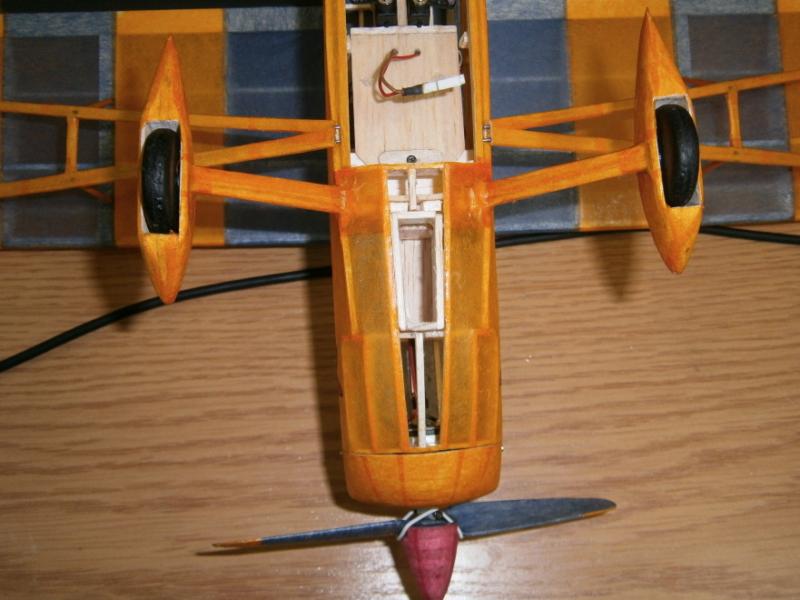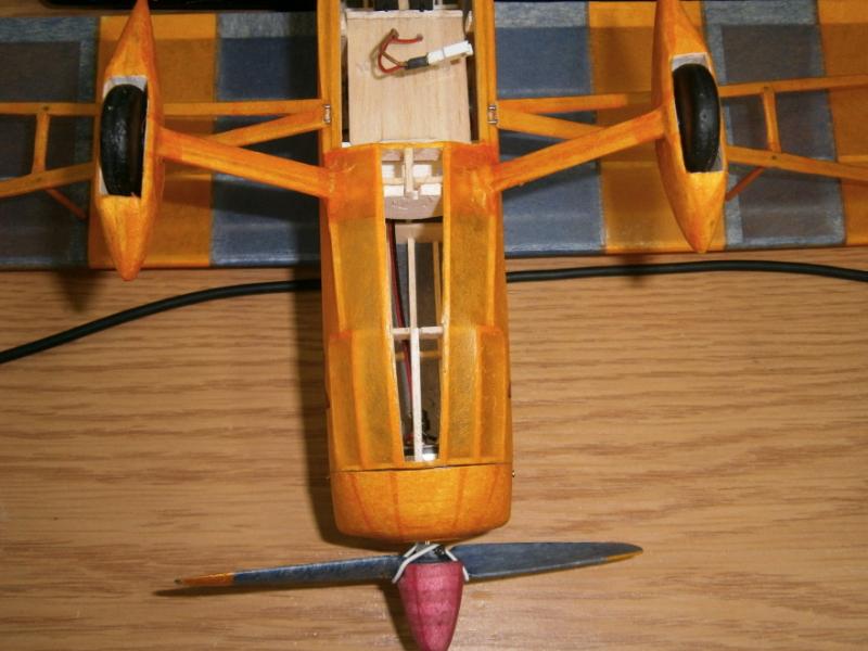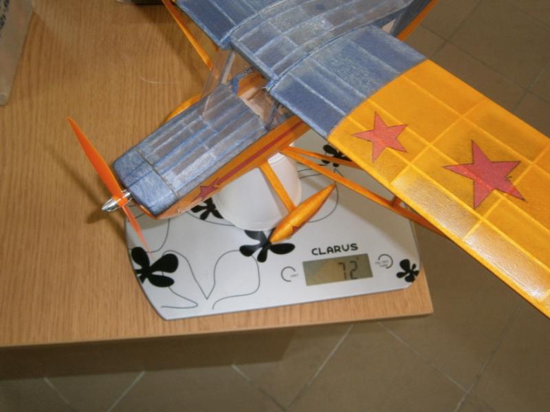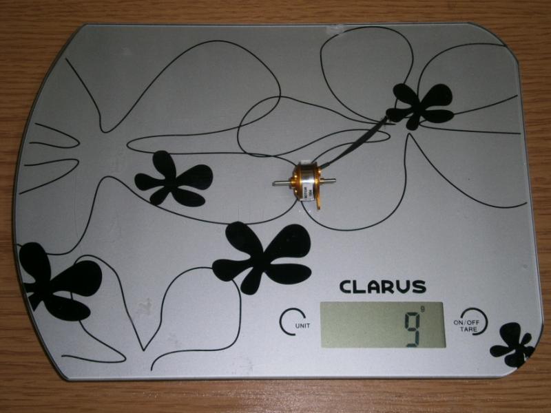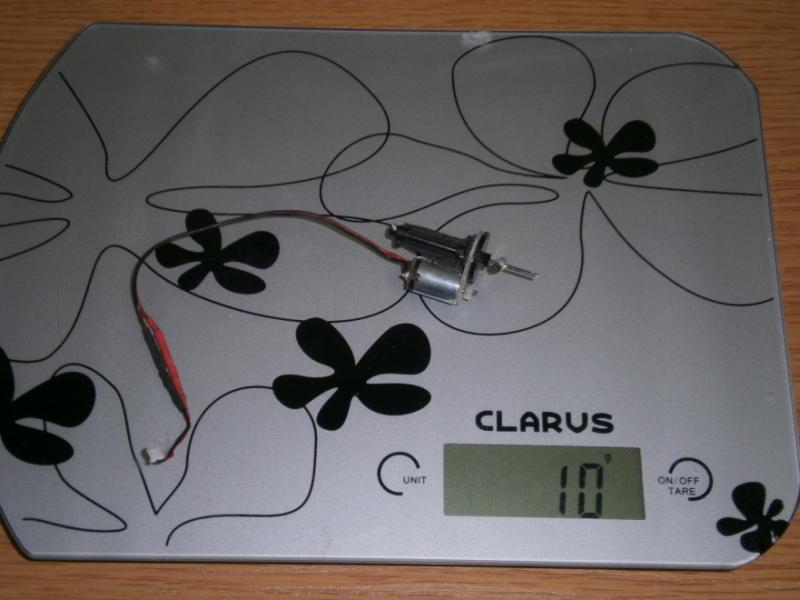 9. Zmiana wyposażenia zakończona,teraz tylko czekać na lotną pogodę dla tego malucha. Pierwsze spostrzeżenia, jeszcze przed lotami. Nowy motorek powinien być zasilany 2-3S. Na 2S do tego malucha stanowczo za duuuużo, byłaby prawie wyścigówka. Na 1S silnik pracuje i ma wystarczający ciąg. Wykorzystam stare aku, trochę mała pojemność, ale do prób wystarczy. Myślę, że do modelu o tej wadze i wielkości w zupełności wystarczy bezszczotka 5g. waga po zmianie wyposażenia