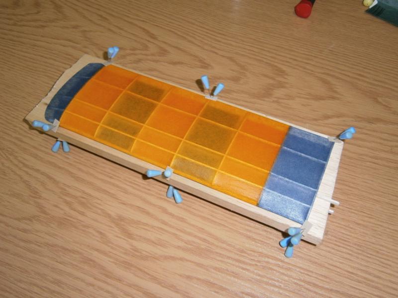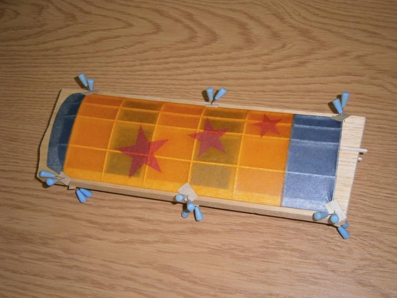 17. To co oklejone już polakierowane. Japonka klejona do konstrukcji średnio-gęstym cellonem, później dwa razy całość rzadkim. Takie maluchy powinny być oklejane cienkim japonem (jak ta niebieska ). Pomarańczowy jest średniej grubości, ale dałem radę.