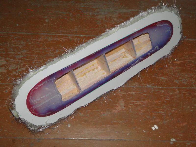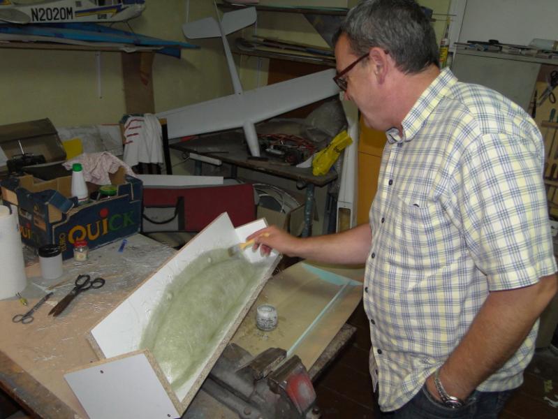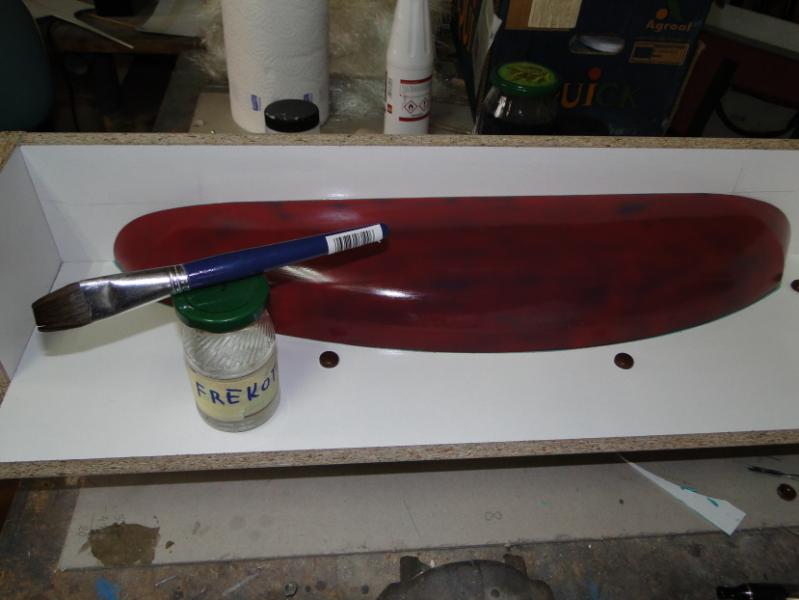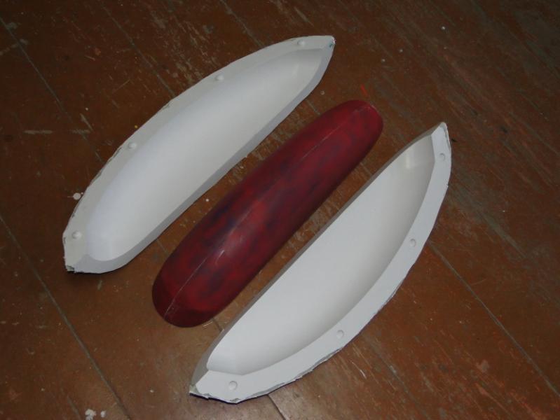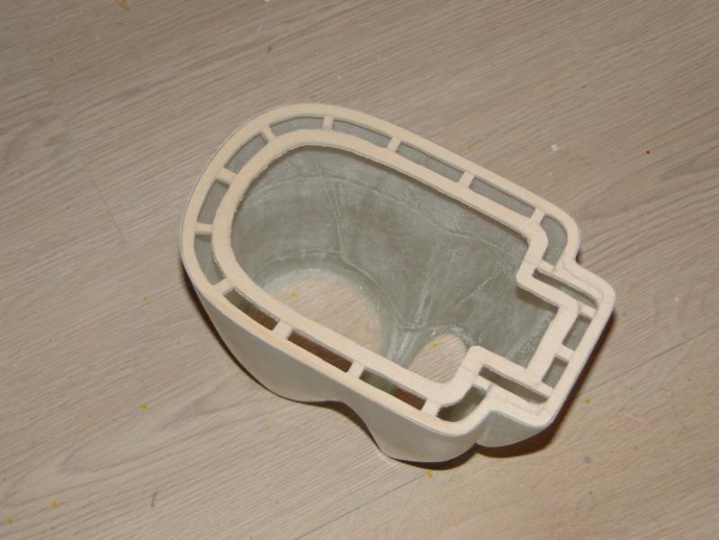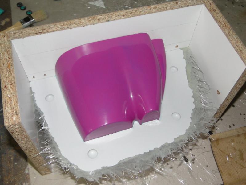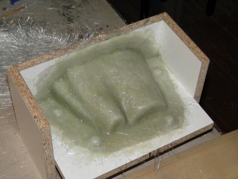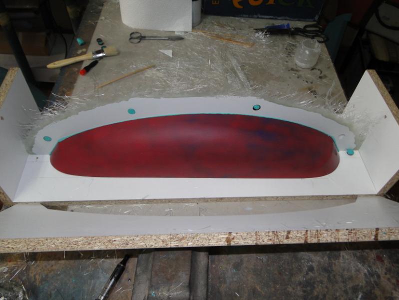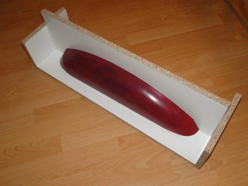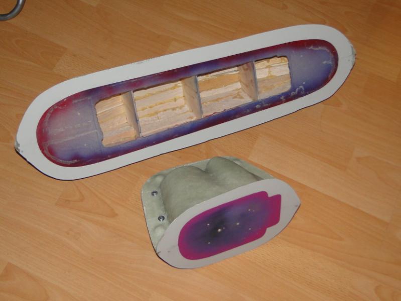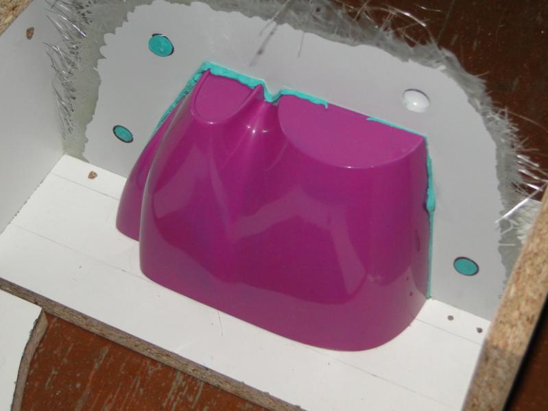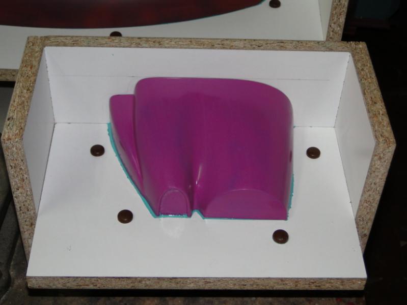 18. Zabrałem się za "wyprodukowanie" form . Najpierw oczywiście "przygotówka". Zaklejenie szczelin w płycie plasteliną, jak widać, cięcia nie są idealne przyklejenie elementów plastikowych, stabilizujących później położenie obu połówek formy podobnie forma do maski silnika pomalowanie gotowych elementów pierwszą warstwą rozdzielacza Frekote FMS po około 30 min mała polerka miękką szmatką, następnie druga warstwa rozdzielacza Frekote Wolo jutro laminowanie pierwszych połówek form