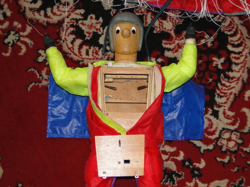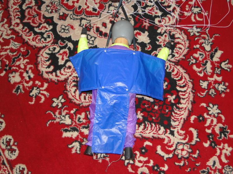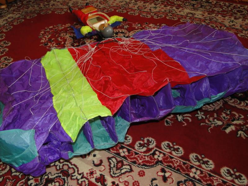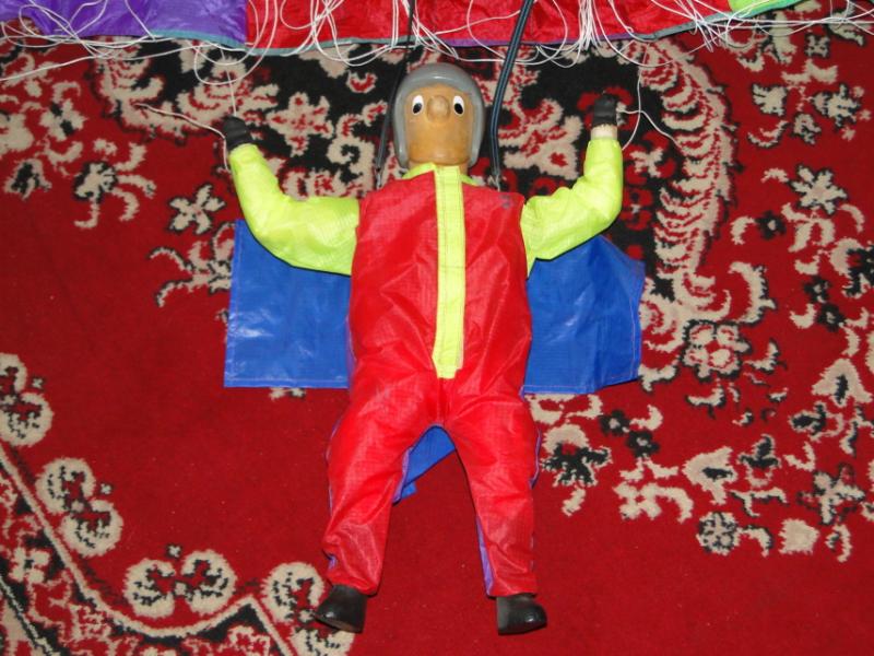Witam "Odkopałem" swojego spadochroniarza . Zbudowany około 20 lat temu z planów z czeskiego Modelara. Wykonał tylko jeden skok z modelu, który można skomentować słowami Siary z "Kilerów dwóch"- I w pi....du wylądował . Czasza szyta całkowicie ręcznie przeze mnie , kombinezon również.