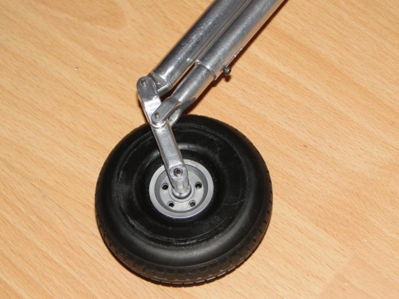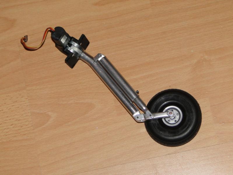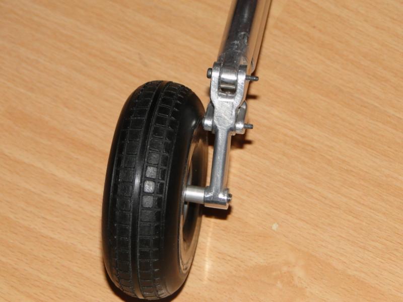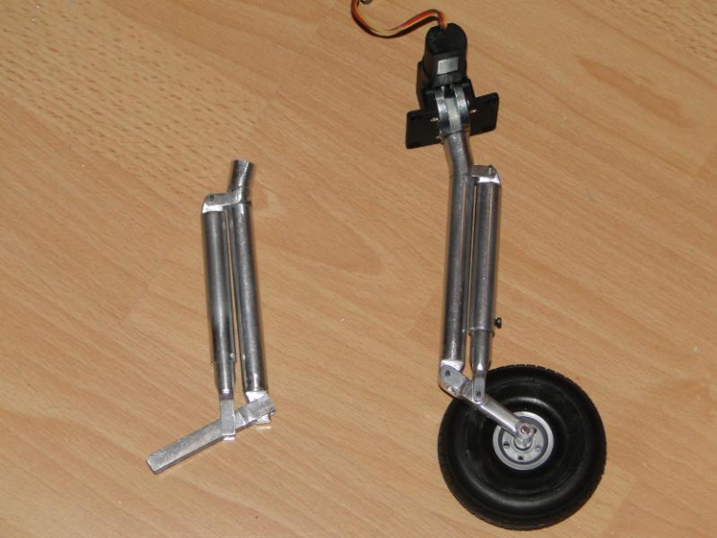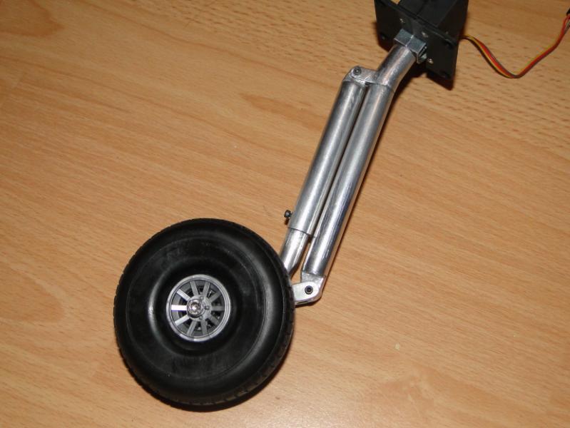15. Witam Trochę czasu upłynęło i dłubię powoli w temacie. Planowałem podwozie druciane, ale jakieś takie brzydkie było no i zacząłem metaloplastykę w duralu. Goleń z kołem waży 79g, koło średnicy 77mm. Amortyzacja koła na sprężynie.