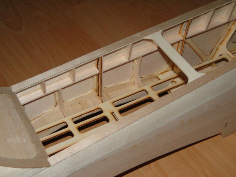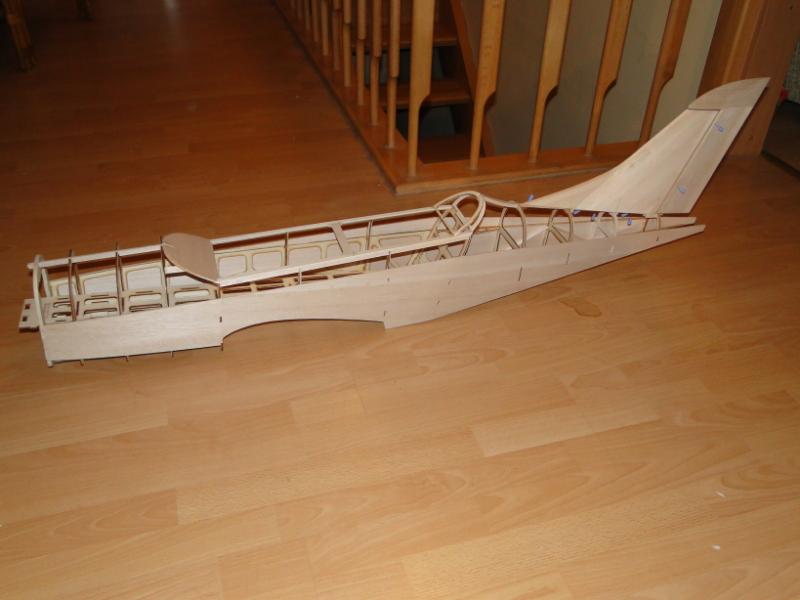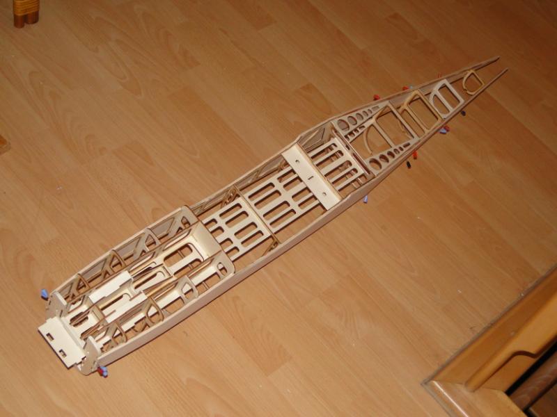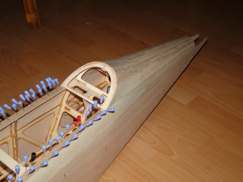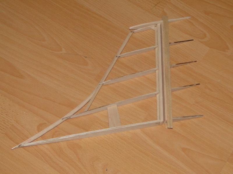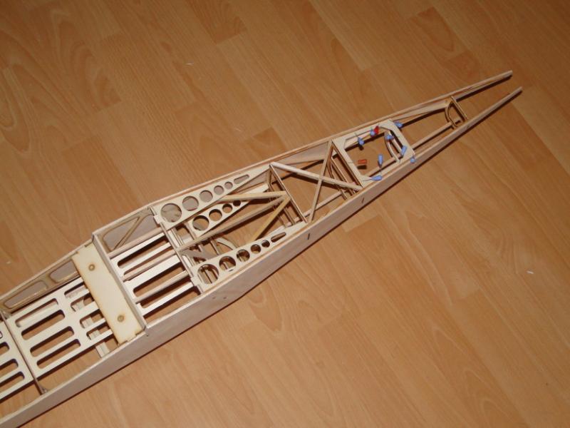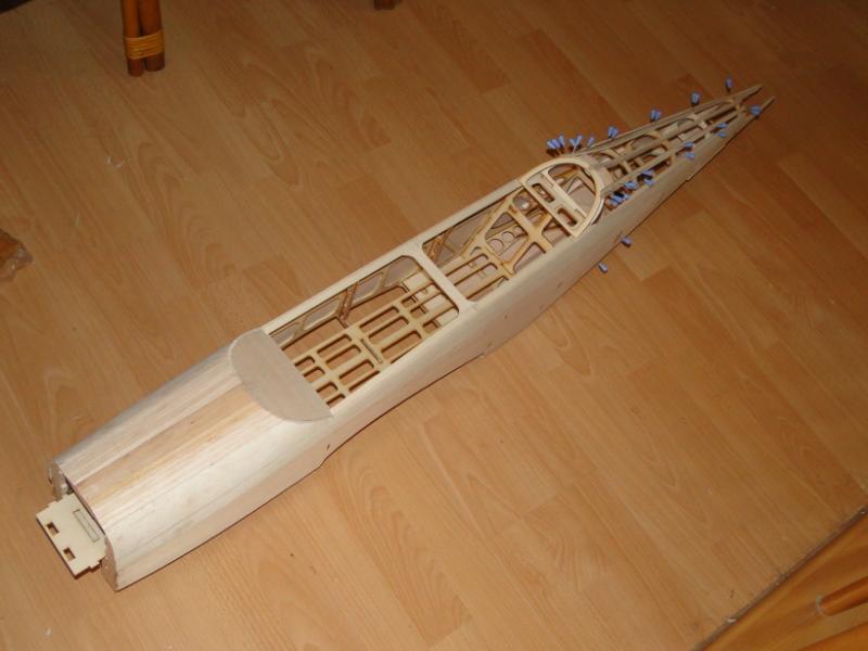 7. Witam Trochę do przodu, parę fotek pokryta górna część kadłuba z tyłu i przejście za kabiną, trochę upierdliwa przy pokrywaniu trochę wzmocnień w obrębie kabiny, bez tego boki były mało sztywne spływ poziomego sklejony na żywicę z paskiem tkaniny 80g/m2 końcówki poziomego sklejone, podobnie jak pionowego, jako "kanapka" z balsy i sklejki 0,6 mm poziomy od spodu bez pasków poszycia, będą wklejone po wywierceniu otworów na zawiasy i usunięciu śmieci