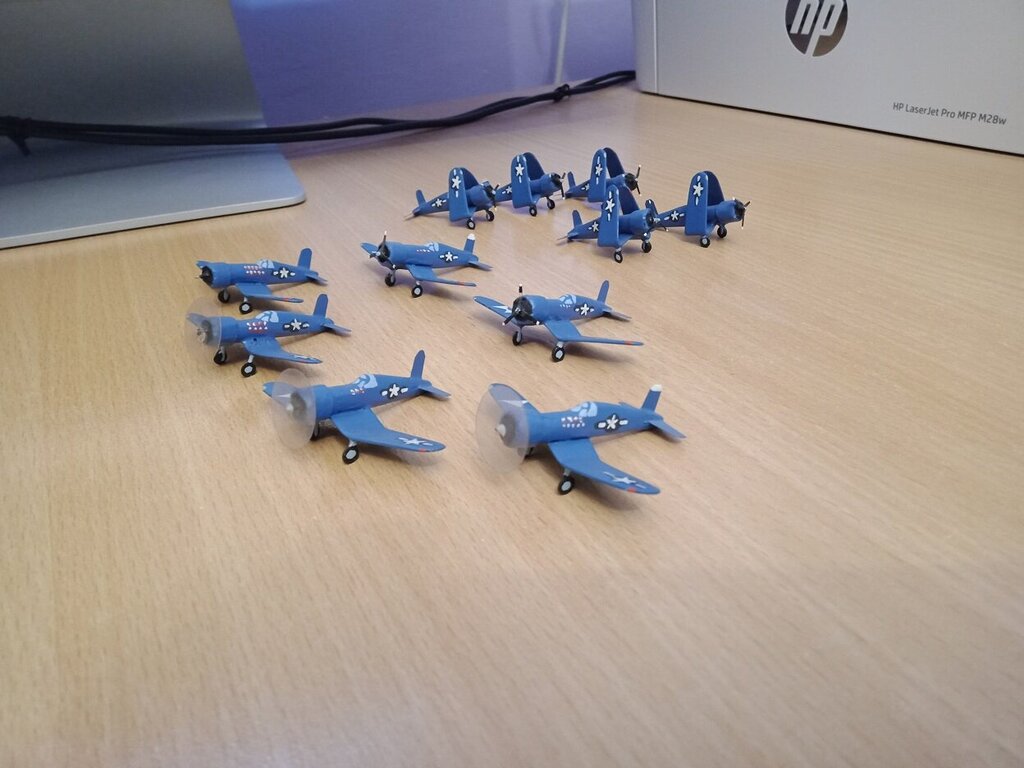 23. Irek. Ten pomysł z kręcącym się śmigłem zastosowałem przy tworzeniu "Corsairów" do tego lotniskowca. Powstały duuużo wcześniej kiedy nie miałem kłopotów ze wzrokiem. Byłem przerażony widząc te samolociki nadrukowane na papierze. Jak to wycinać?? O klejeniu nie wspomnę. Nie było wtedy w sprzedaży nożyków do papieru jak teraz. Nożyczki, ewentualnie skombinowany po znajomości lekarski skalpel. Zdecydowałem się wykonać je z patyczka i cienkiej blaszki. Miały być dla syna. Jakoś uchowały się do dzisiaj. Dopiero teraz do budowy tego lotniskowca mobilizuje mnie wnuk. Warto zbudować model za 30000 zł.?