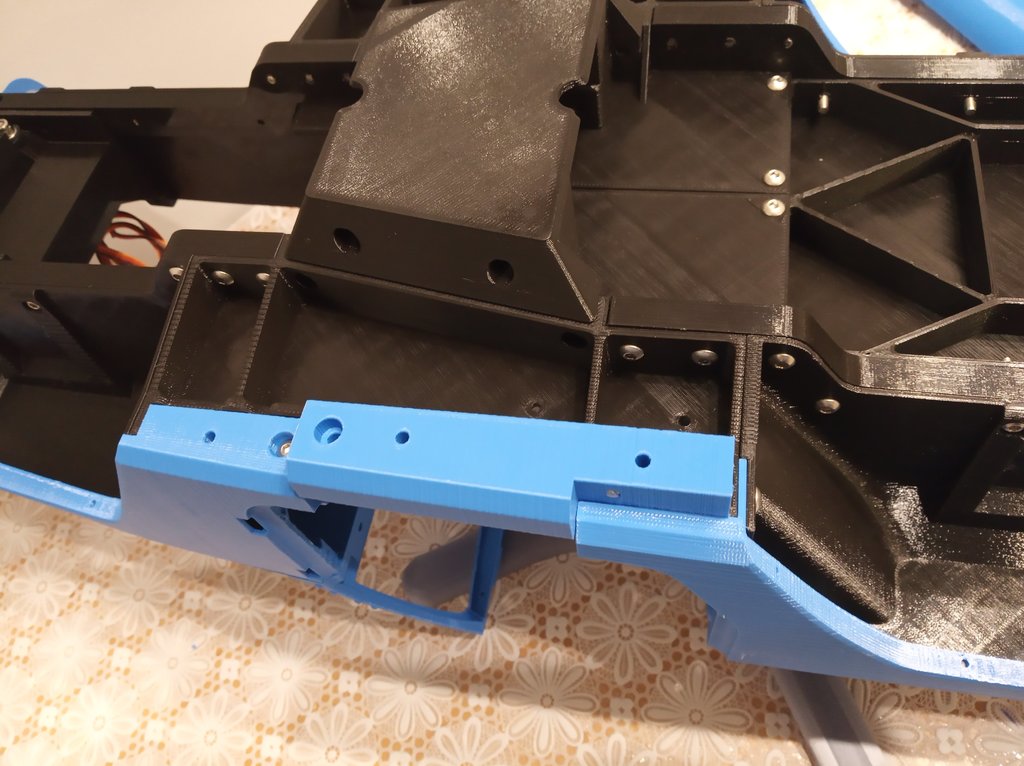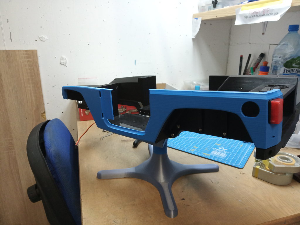 Poskręcana buda z podwoziem. Drobny problem z progami, z jednej strony trzeba spiłować. Zawieszenie na drukarce, ale ze składaniem czekam, aż wydrukuję przekładnię, a tą chcę zrobić z PA. Jednak zanim przygotuję do tego drukarkę, puszczę chyba jeszcze fotele. -