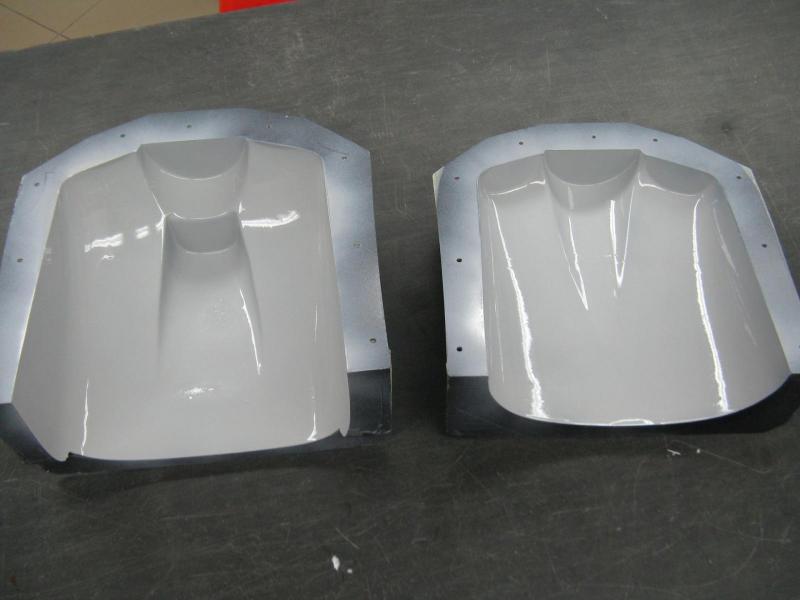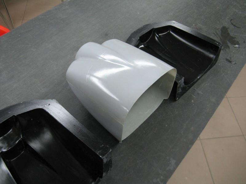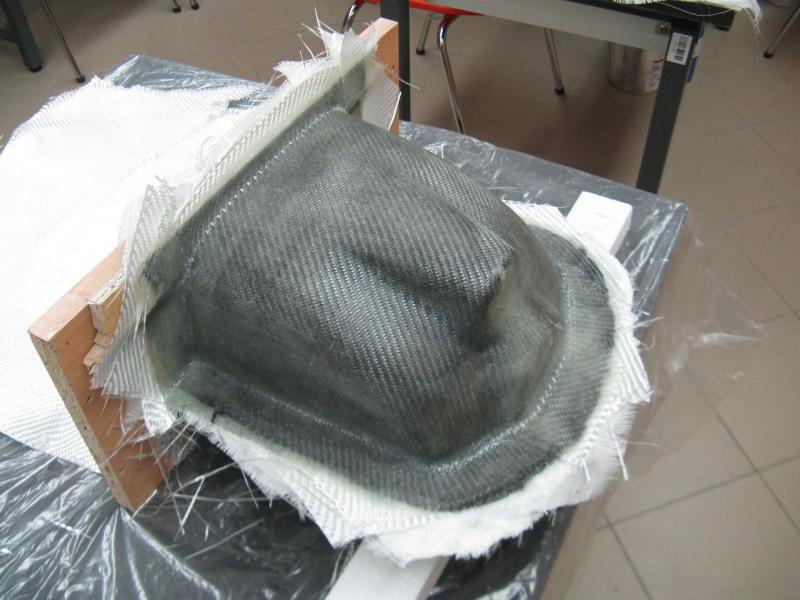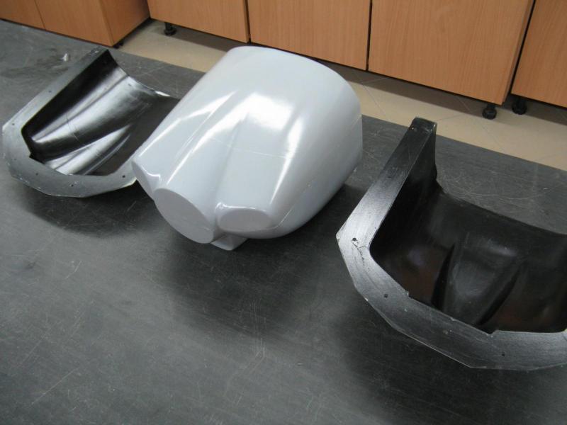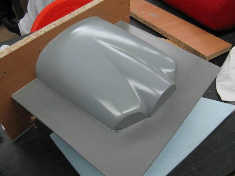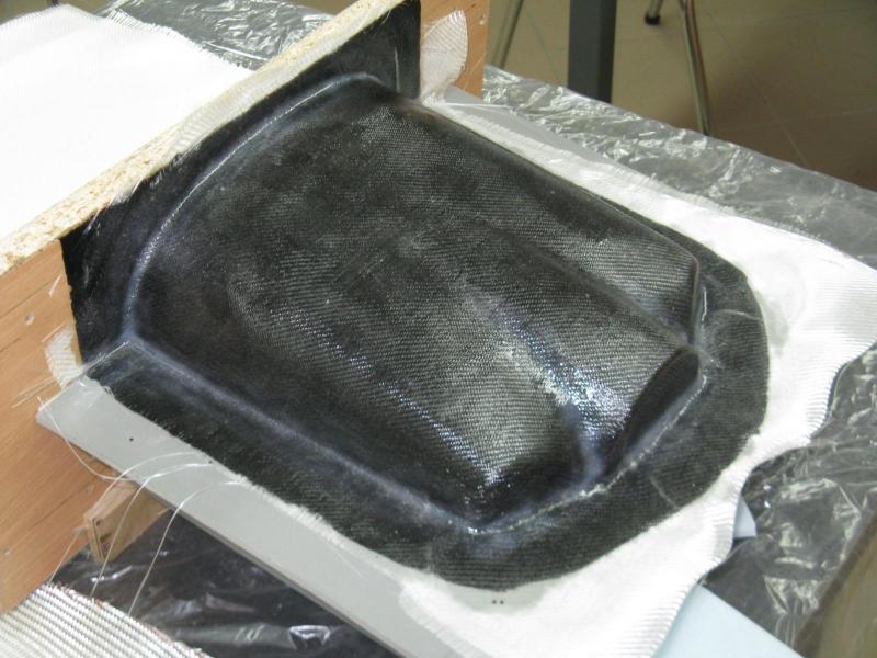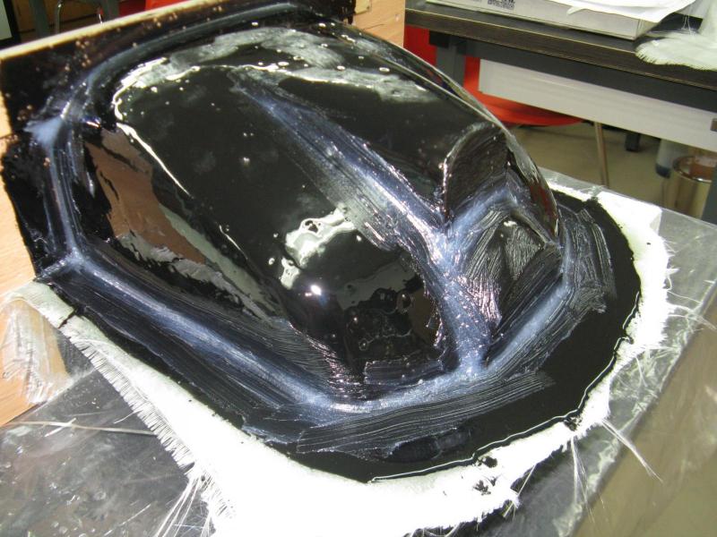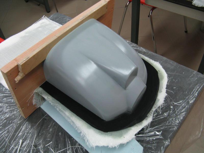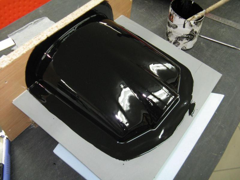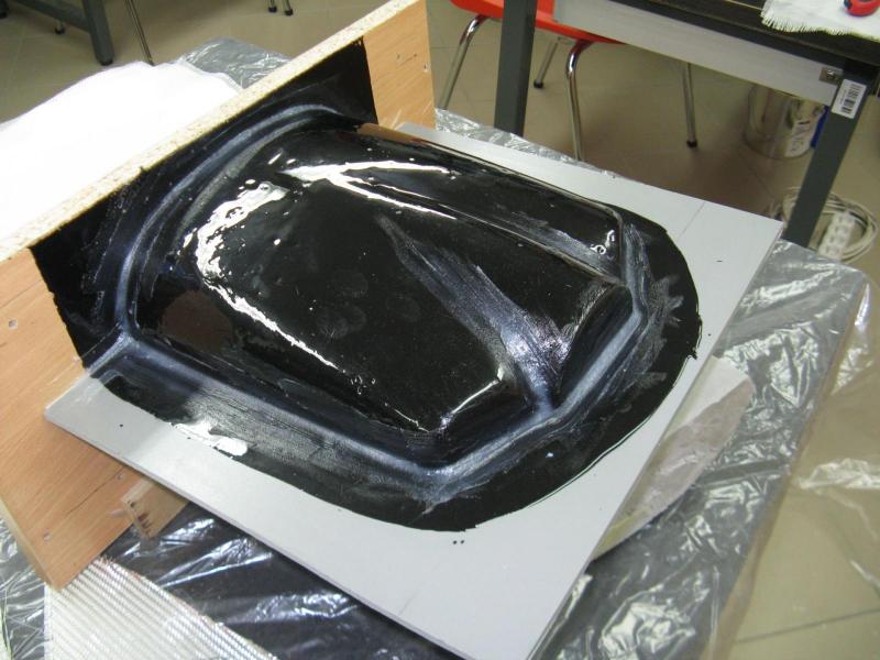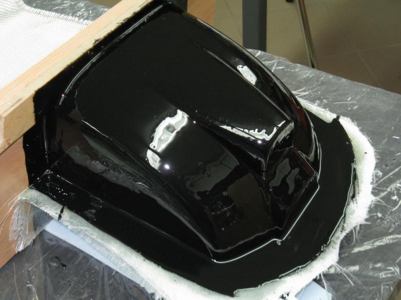 Forma do maski silnika. Kopyto i podział formy tym razem nie na lewą i prawą połówkę, ale na górę maski i dół. Położenie warstwy żelkotu narzędziowego Wypełnienie ostrych przejść szpachlówką wykonaną na bazie żywicy epoksydowej i krzemionki. Położenie dwóch warstw tkaniny 80g. Ostatnie warstwy formy - 3 warstwy tkaniny 390g. Czekamy -