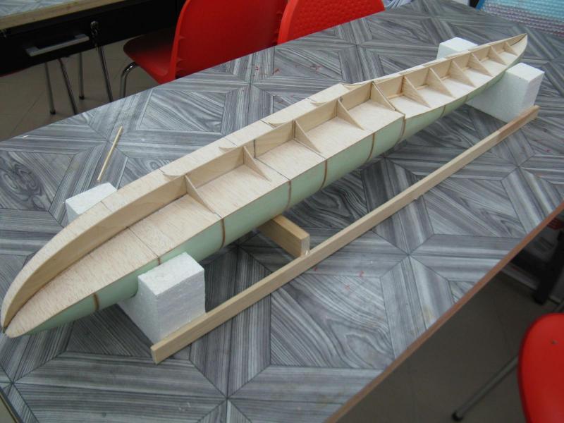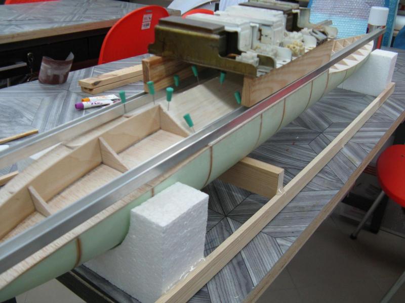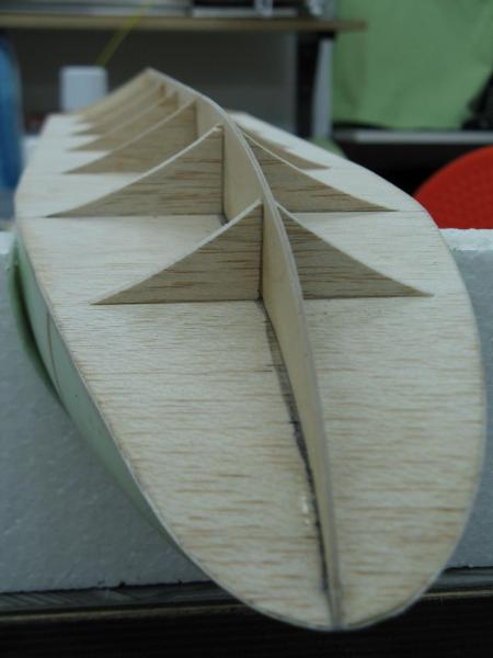 9. Zbychu, rób ten model i niczym się nie przejmuj. Dalsza część prac nad pływakiem. Oklejony spód i doszlifowany wstępnie kształt.