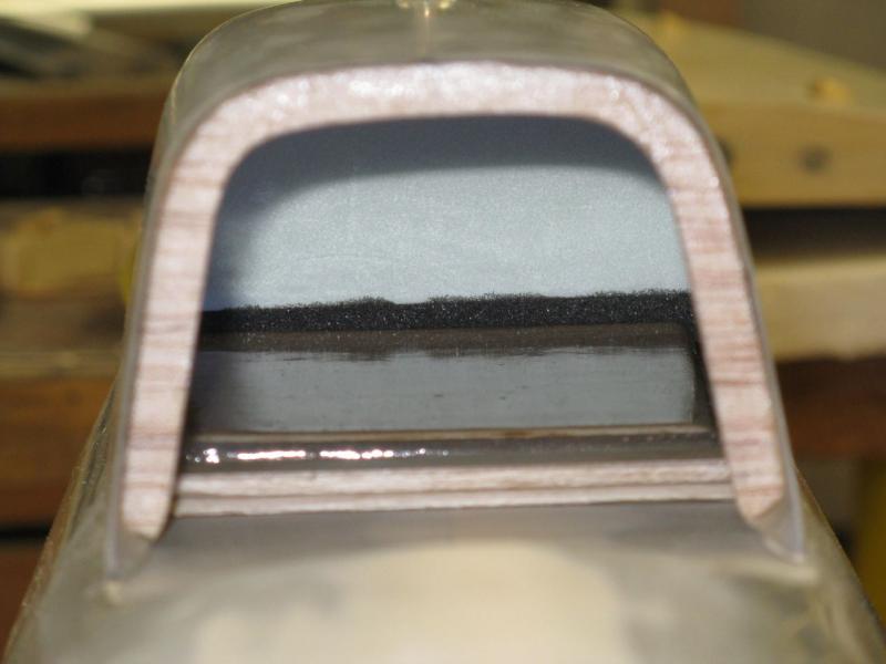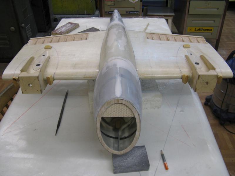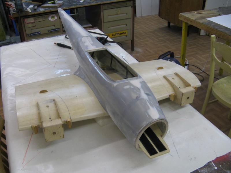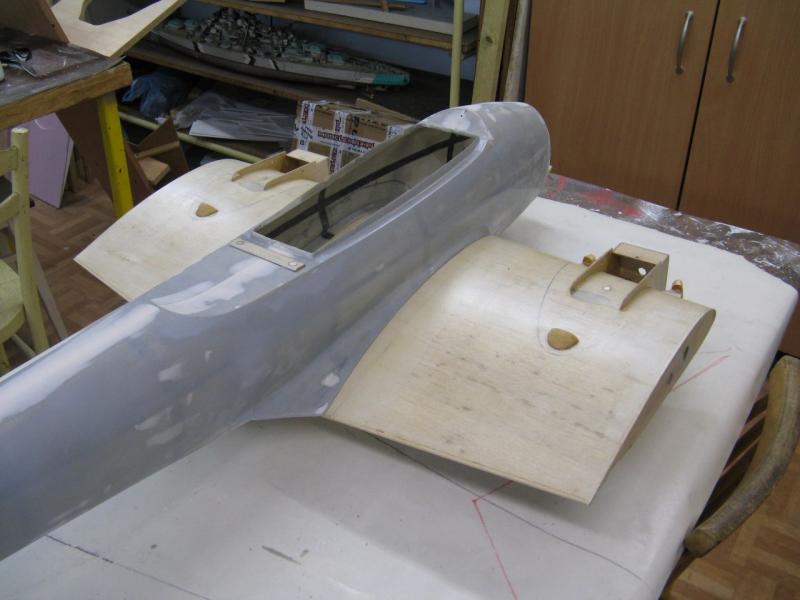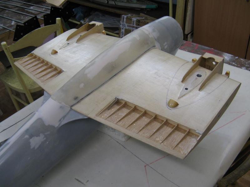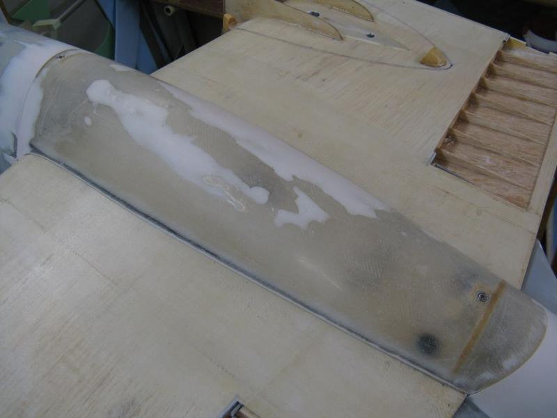 Popracuj jeszcze nad kadłubem . Za kabiną pilota linia góry kadłuba była prosta, takie krótkie przedłużenie kabiny. Natomiast, aby uzyskać większe wklęśnięcie przejścia kadłub-skrzydło, możesz zrobić sobie prosty przyrząd do obróbki w postaci papieru ściernego naklejonego na odcinek rury z PCV średnicy 50mm, takiej jak idą do instalacji wodnej.