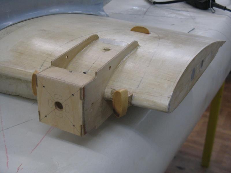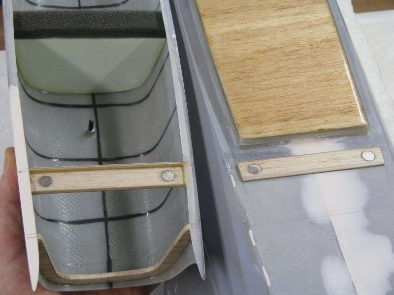 Mocowanie kabiny zrobiłem klasycznie, czyli kołeczek z przodu i dwa magnesy neodymowe z tyłu. Wklejona wręga ze styroduru z naklejoną gąbką dociska pokrywę kadłuba i zabezpiecza ją przed samoczynnym otwarciem -