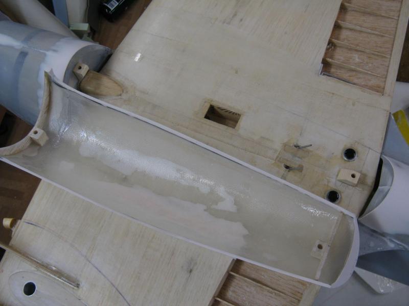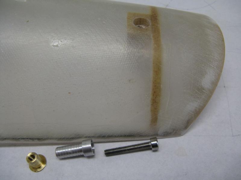 Do zamontowania elementu kadłuba pod skrzydłem, zrobiłem tulejki prowadzące z duralu (wklejone w spód kadłuba) i nagwintowane tulejki z mosiądzu jako nakrętki. -