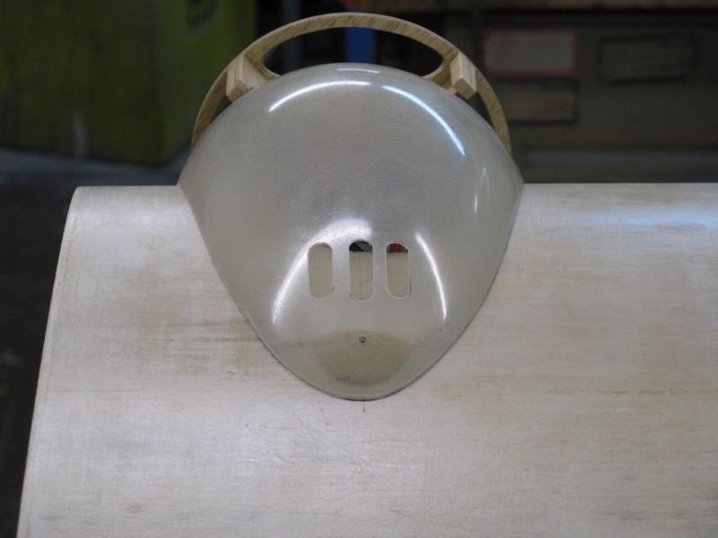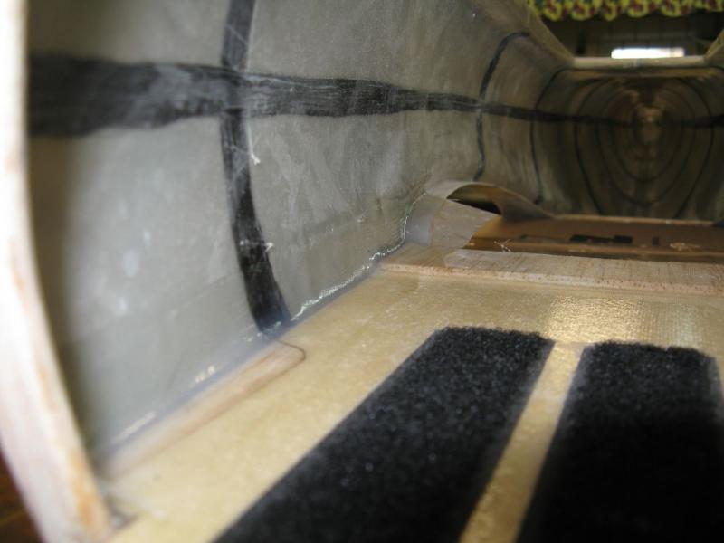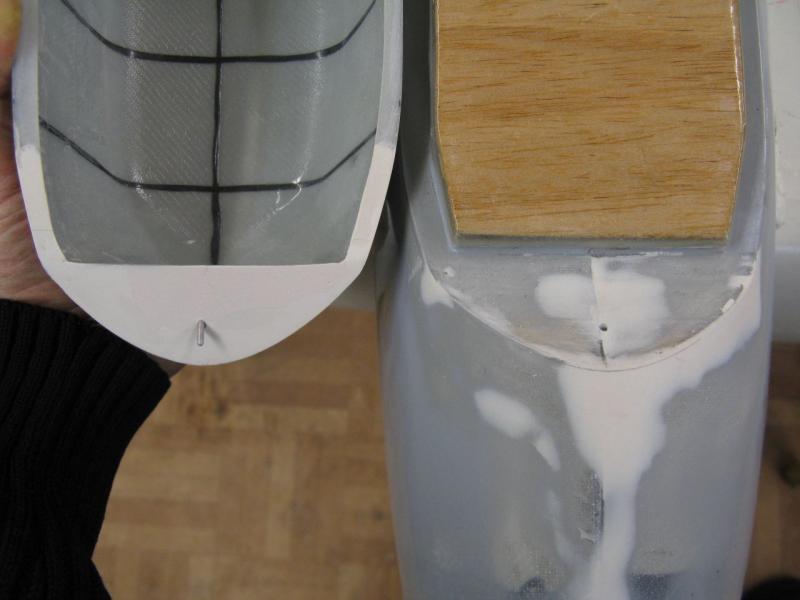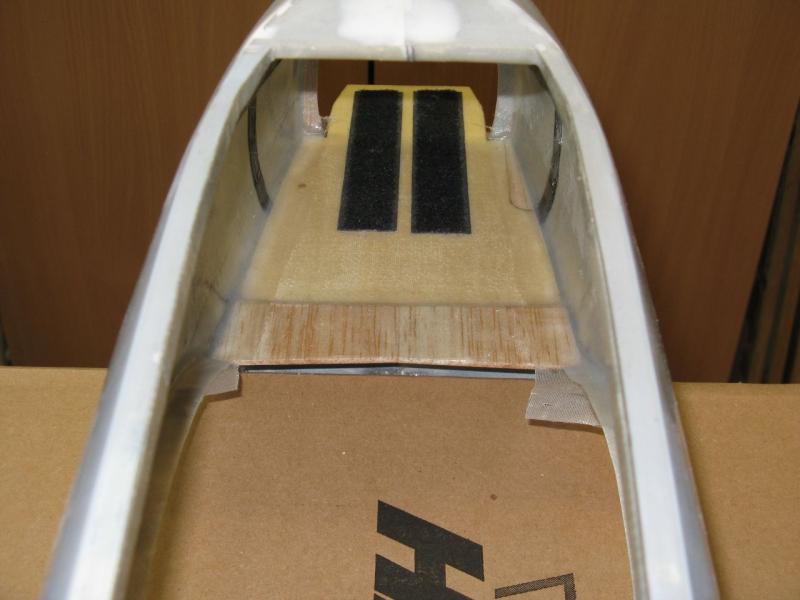 Początkowo chciałem półkę na akumulatory zrobić przykręcaną aby mieć możliwość wykonania reflektora do lądowania jak w Łosiu. Zrobiłem już nawet elementy mocujące, ale doszedłem do wniosku, że wklejenie tej półki przyniesie większą korzyść niż zrobienie reflektora . Po pierwsze - wzmocni zdecydowanie przód stając się elementem konstrukcyjnym trwale związanym z bokami kadłuba tym samym usztywniając konstrukcję, po drugie - uprości procedurę montażu półki bo odpadnie kwestia gimnastyki z tulejkami, śrubkami i innymi nieprzewidzianymi historiami, po trzecie - stworzy zamkniętą i szczelną przestrzeń z przodu kadłuba. Dlatego też wkleiłem półkę i zalaminowałem połączenie paskami tkaniny 48g. -
