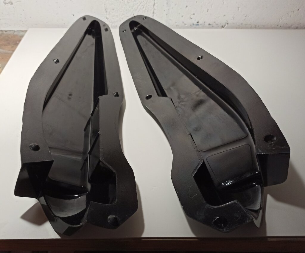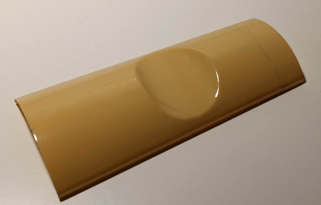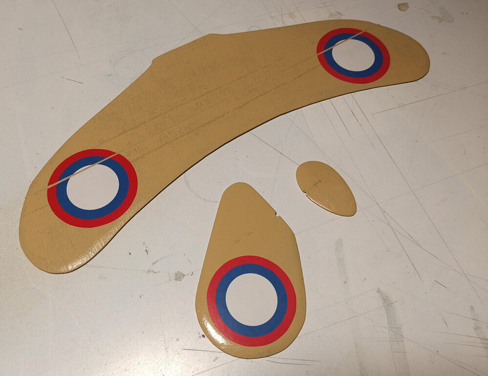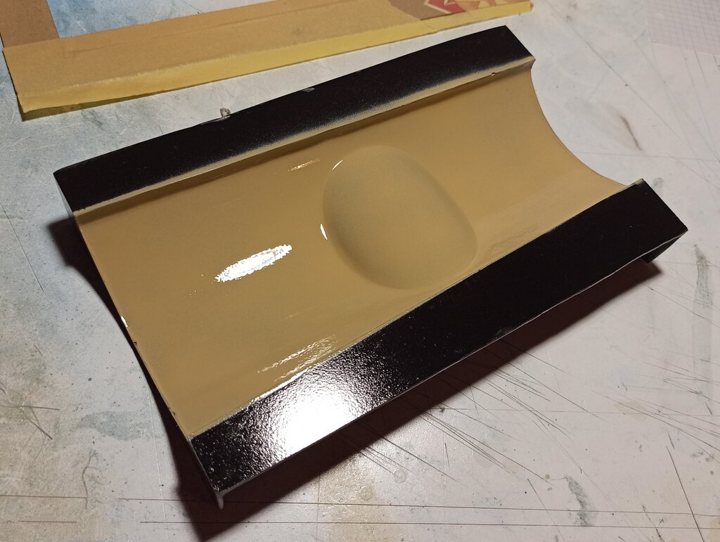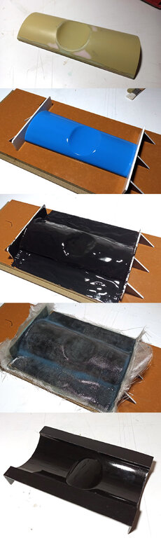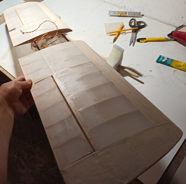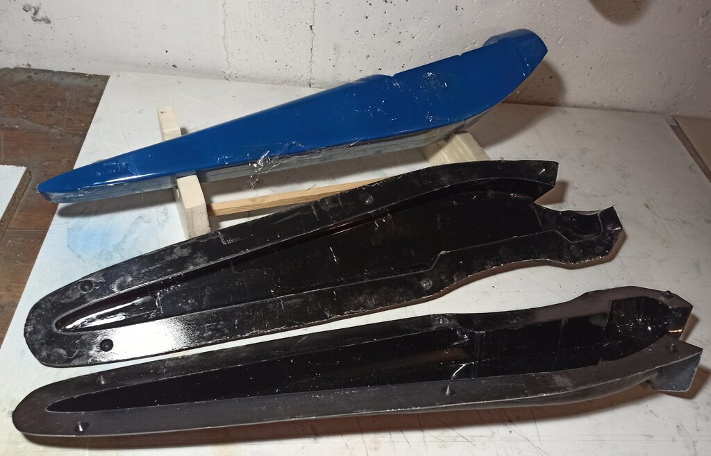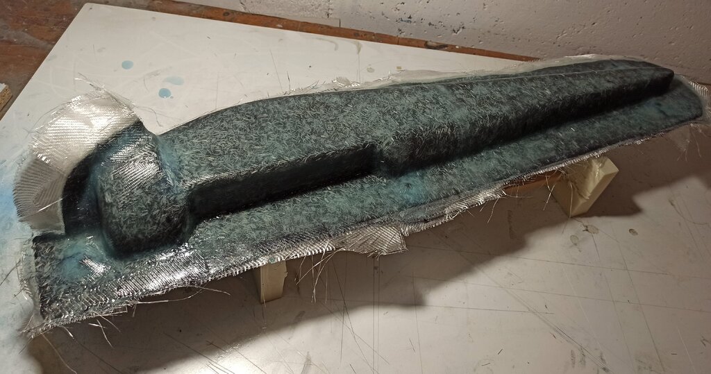 No cóż, nie obyło się bez darcia papierem ściernym - zeszlifowałem wszystko prawie do zera i odtworzyłem na tyle na ile się dało powierzchnię i szczegóły. Przy okazji przypomiałem sobie, że forma musi mieć dostęp do środka do klejenia połówek, więc dodałem kołnierz przy masce. Po malowaniu lakierem (tym razem motip): Potem 5 razy wosk, forma do podziału, uszczelnienie plastelinką, nawiercone "zamki": Na to pva, na to żelkot i szmata z żywicą: W międzyczasie oklejone skrzydło. Jednak podszewka i lakier - może więcej roboty, ale czy mi się śpieszy? Oraz gotowe stateczniki, pomalowane i z oznaczeniami: Po wyjęciu z podziału połówka formy wyszła tak: