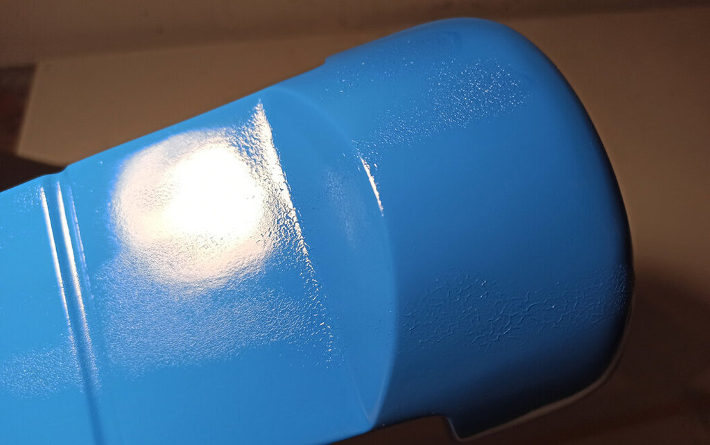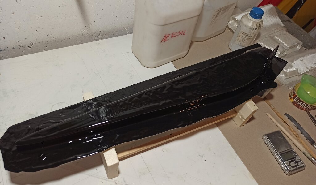 Tymczasem prac ciąg dalszy. Stateczniki wyjęte z wora i oczyszczone. Przed laminowaniem 14,5 grama, po 28 g. Zabrałem się za formy. Najpierw maska: Jeszcze nie mam wyczucia w ilości towaru. Żelkotu i żywicy rozrobiłem przynajmniej dwa razy za dużo, więc forma wyszła pancerna, bez szału ale może być. Problemy pojawiły się przy kadłubie. Kopyto, które kryłem chemią motipa (filler, podkład) po pomalowaniu dwoma warstwami błyszczącego lakieru wyszło w miarę ok. Ale w trakcie schnięcia jakiś pająk postanowił sobie zrobić spacer po wysychającym lakierze i zostały ślady. Więc po 24 h po lekkim punktowym szlifie dałem jeszcze jedną warstwę tego lakieru co wcześniej. I się spie.....liło!!! Lakier pod spodem spuchł i popękał... Lakier nie był motipa - jakis zwykły marketowy. Coś się ze sobą "pogryzło". Ratując sytuację po 24 h zmatowiłem całość an mokro papierem 500 i 1200. Teraz to muszę znowu pomalować.Co radzicie? Polecieć jeszcze raz tym lakierem, czy może najpierw dać warstwę podkładu i pomalować na nowo ale tym razem lakierem motipa? Czy może nie ryzykować, wypolerować to co jest lecieć z formą? Szlifować tego do warstwy podkładowej nie zamierzam - za dużo roboty i misternie zrobione linie podziału mi się pozacierają.