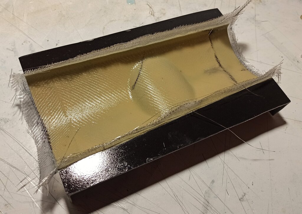 Forma zamknięta. Na drugiej połówce użyłem jako pierwszej warstwy po żelkocie siekanego włókna szklanego-trochę łatwiej było pierwszą warstwę tkaniny położyć. W międzyczasie zalaminowałem maskę. Jutro się okaże co i jak.