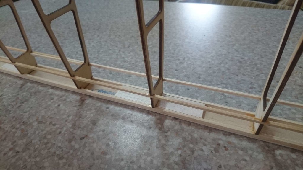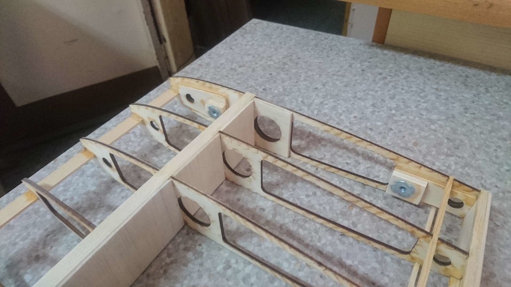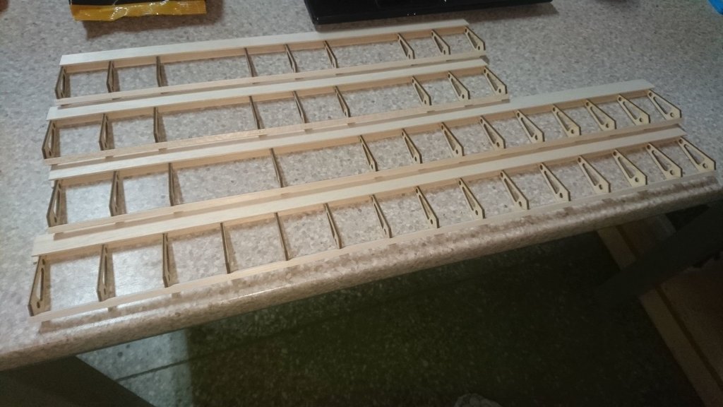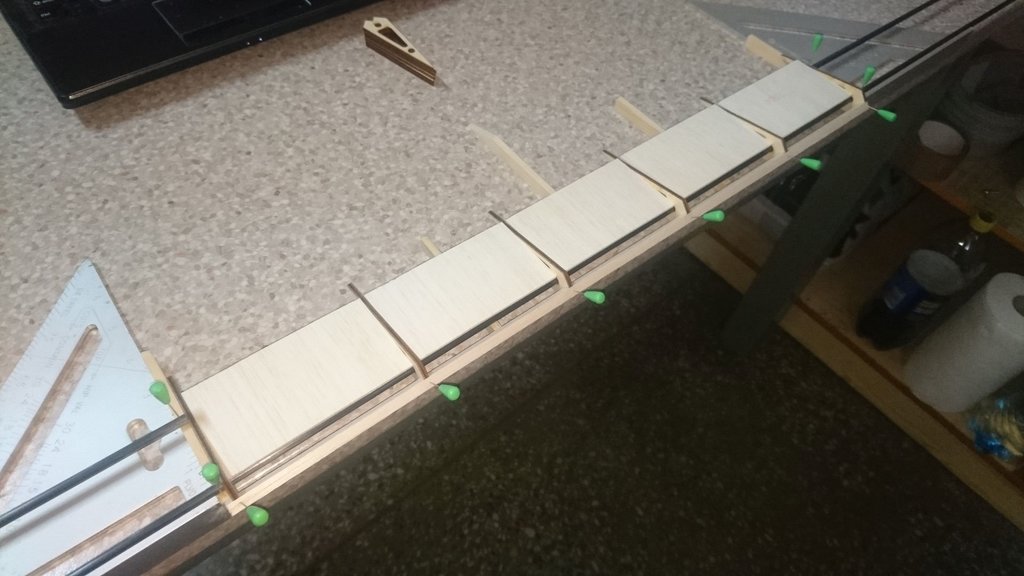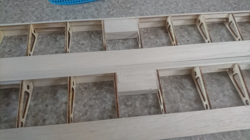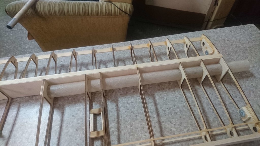 ciąg dalszy skrzydła wstawiam wypełnienia sklejkowe pod zastrzały, rurki łączące pierwsze żeberka i można przyklejać keson