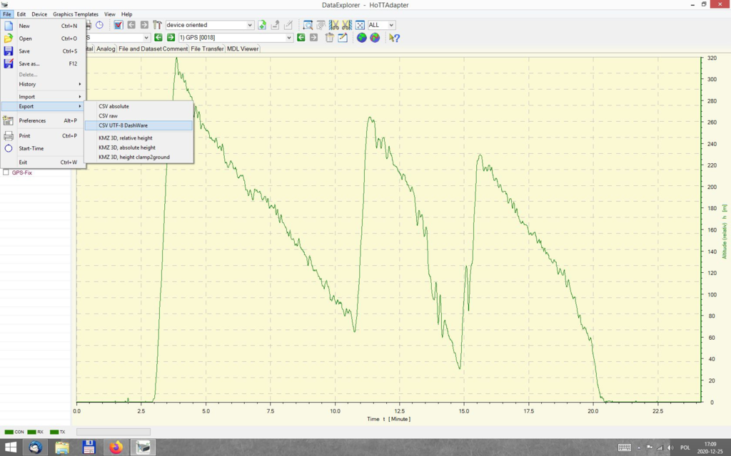 Witam wszystkich. Od pewnego czasu walczę z wgraniem danych telemetrycznych z GPS-u Graupnera do programu Dashware. Po wczytaniu do Data Explorer robię export: Ale w Dashware pojawia się problem bo w trakcie wskazywania pliku z danymi nie występuje profil, który wskazuje na dane pochodzące z Hott Graupnera. Wybierając po kolei inne profile dostaję poniższe komunikaty: albo taki: albo taki: Słaby jestem z angielskiego, ale z tego co rozszyfrowałem z komunikatów to wynika, że problem jest m.in. w układzie kolumn lub rodzaju separatorów. Czy ktoś już to przerabiał? Może ma jakąś przykładową tabelę z danymi, do której mógłbym wstawiać swoje dane z telememetrii? Program ten ma chyba możliwość stworzenia własnego profilu danych telemetrycznych ale nie jestem w stanie go stworzyć, bo cały czas te komunikaty wyskakują. A może wina leży po stronie Data Explorera bo źle eksportuje dane (niby jest opcja eksportu do Dashware)? Może są jakieś inne (nie koniecznie darmowe) programy, które by sobie z tym poradziły? Pozdrawiam Marcin Kozioł