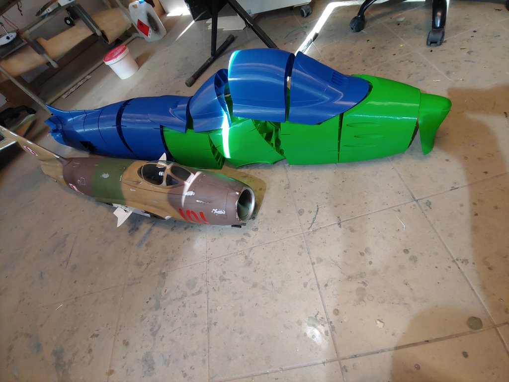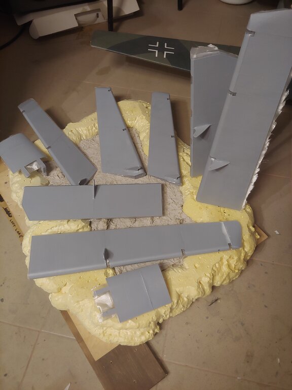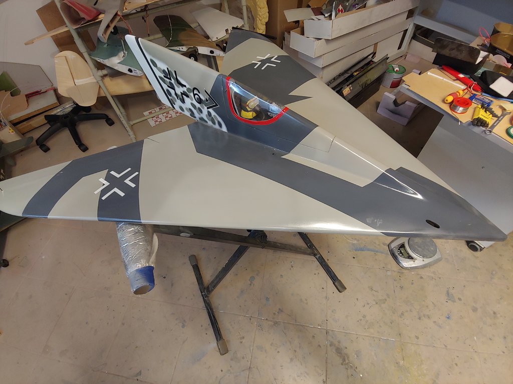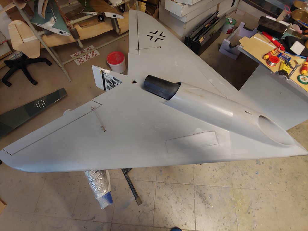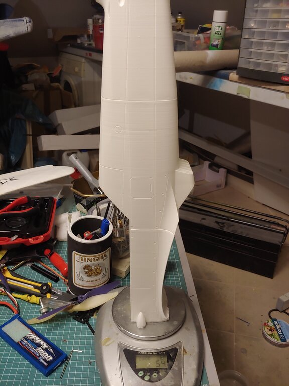 Posklejałem poszczególne elementy. Tak się prezentuje. To co na zdjęciu waży 3900g. Stery jakieś 200 g. Z pokryciem tkaniną 25g zamierzam zmieścić się w 4500g. -