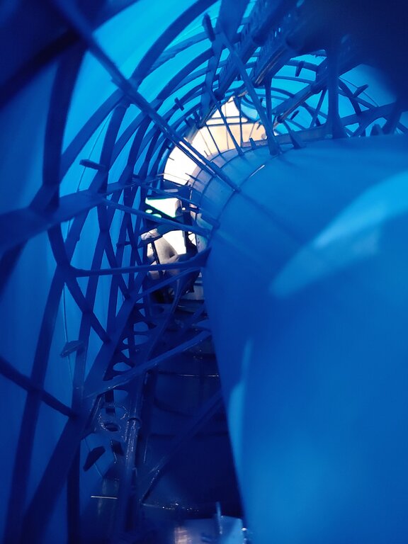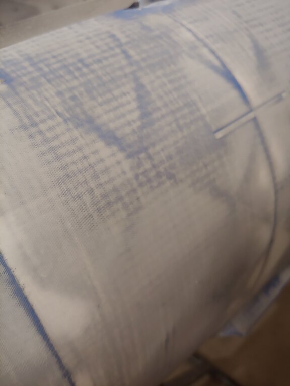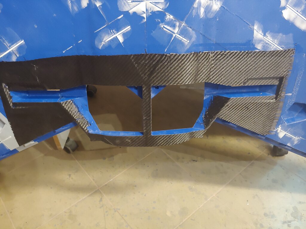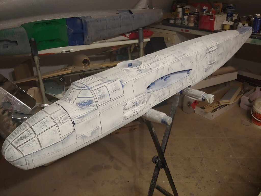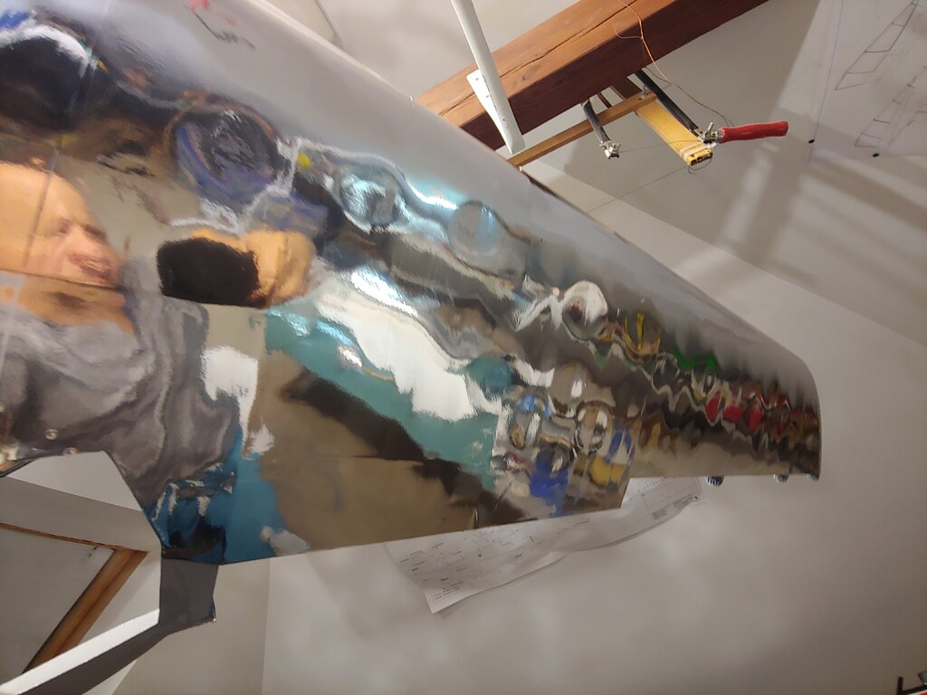 Wnętrze sterowca? Obawiam się nieco o tą rurę. Nie wzbudza zaufania. Cały płatowiec został pokryty tkaniną 47g/ m2. W wezłach podwozia głównego doszła jeszcze tkanina węglowa. Po utwardzeniu żywicy, uzupełniłem większe wpadki i pokryłem podkładem novol. Podkład ujawnia kolejne niedoskonałości które teraz można uzupełnić lekkim akrylem albo hobbylite. Całość przeszlifowałem. Trzeba uważać na łączeniach segmentów, żeby nie przeszlifować tkaniny, o co jest łatwo bo druk w tym miejscu przeważnie wystaje ponad powierzchnię. -