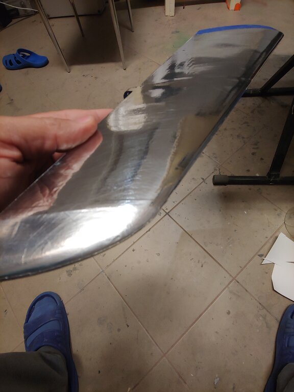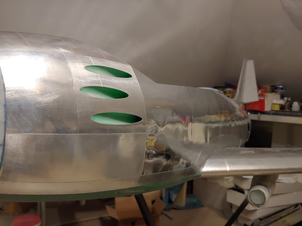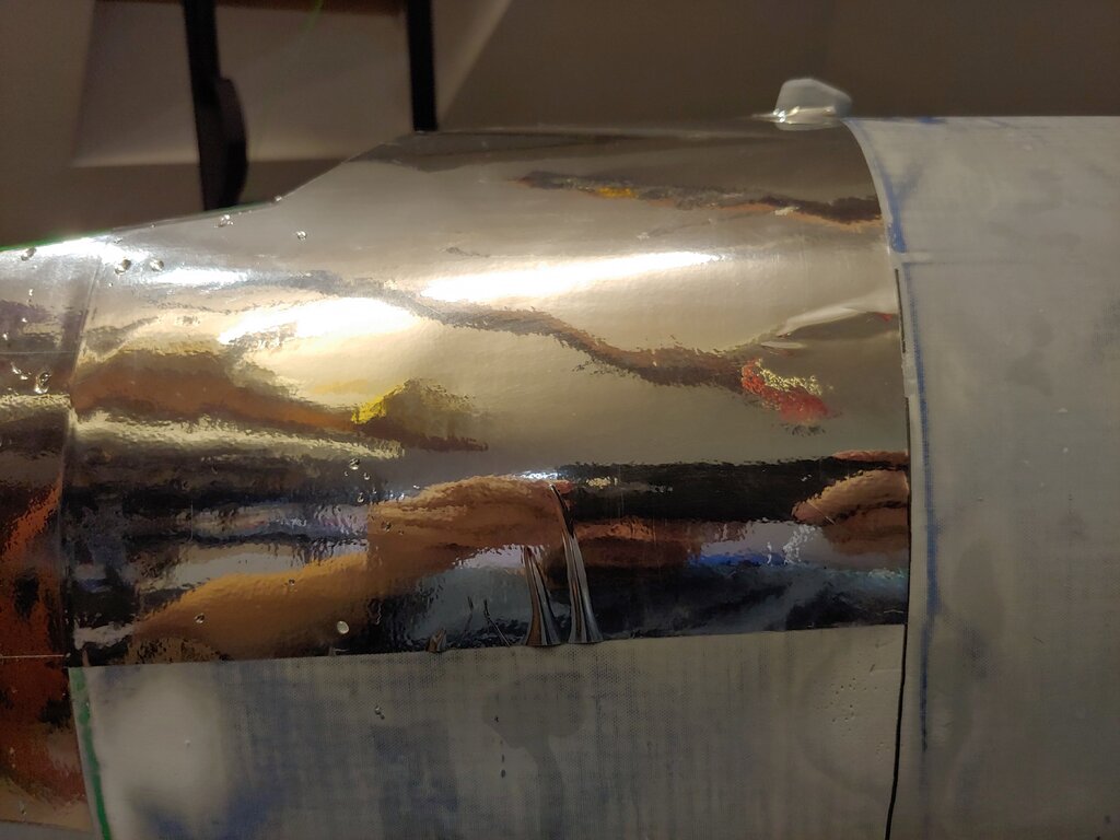 Tak wygląda powierzchnia po szlifowaniu. Zagłebienia w druku, szczególnie powiększonego modelu skutecznie odstraszyły mnie od jego malowania. Taki ładny samolot zasługuje na fajniejsze wykończenie. Od jakiegoś czasu leżała u mnie w modelarni rolka folii ploterowej oracal 352 23 mikrony. Postanowiłem spróbować. Folia niestety nie nadaje się do aplikacji na nierozwijalnych powierzchniach. Poddaje się tylko nieznacznie. Nos okleiłem taśmą Alu 25 i 50 mikronów. Tak samo owiewki ogona, końcówki powierzchni sterowych i skrzydeł. Taśmy od wentylacji i kominków. Ta 50 mikronów daje już możliwość układania na większych krzywiznach. Nie ma co przesadzać bo już zaczyna ważyć swoje. Jeśli nie trzeba było, stosowałem tą cieńszą. Folia poliestrowa na całe skrzydło waży 80g / już z końcówkami alu/ A skrzydełko ma 2m przy cięciwie u nasady 55 cm. Chodziło mi o to, żeby do lotu trzeba było zakładać podwójnie przyciemniane pingle. Folia super się trzyma i wygląda trochę jak wygnieciona blacha. Zdradza ją regularność tych zagłębień. -