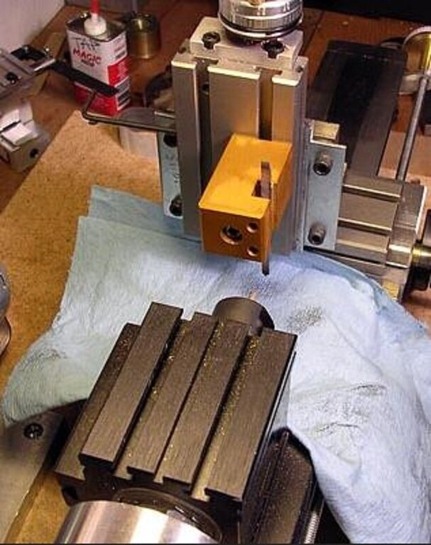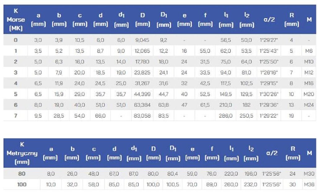 12. Czasem potrzebowalibyśmy zrobić sobie jakieś narzędzie z chwytem Morse'a, Ten film podpowiada jak taki chwyt wytoczyć na nawet najmniejszej tokarce. Jeśli mamy statyw(np magnetyczny) do czujnika zegarowego 0,001mm*(1µm - najlepiej, bo czujnik 0,01mmm może nie ustawić zbyt dokładnie kąta, a jak widać w tabeli liczą się już sekundy kątowe by stożek był samozakleszczający), to dorabianie oprawki do mocowania w imaku z pierwszej części filmu możemy opuścić, kwestia tylko ustawienia czujnika na wysokości osi toczenia(np do kła), i ustawienie obrotnicy do kła wzorcowego. Potrzebny do tego będzie kieł stały o wielkości chwytu takiej jaką chcemy wykonać (każda wielkość K stożka Morse'a ma nieco inny kąt α/2 niż inne wielkości**) Chwyty takie najlepiej wykonywać z nieco twardszej (ale nie hartowanej) stali płytką o większym(r≥0,4mm) promieniu, wtedy chropowatość powierzchni będzie mniejsza. * - najlepiej o czułości 1µm, bo czujnik 0,01mmm może nie ustawić zbyt dokładnie kąta, a jak widać w tabeli liczą się już sekundy kątowe by stożek był samozakleszczający. ** - https://www.e-darmet.pl/chwyt-morse-din228-cid-8.html